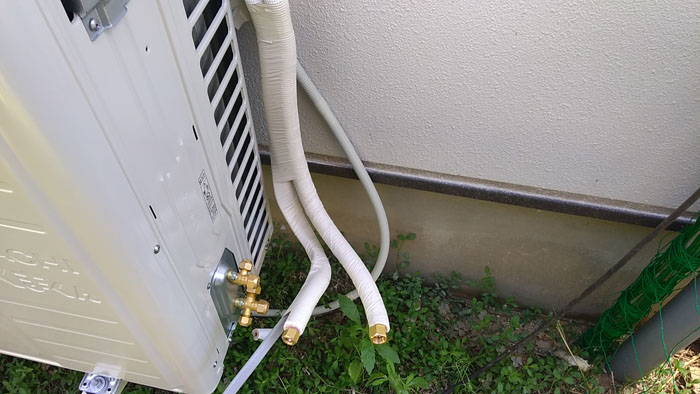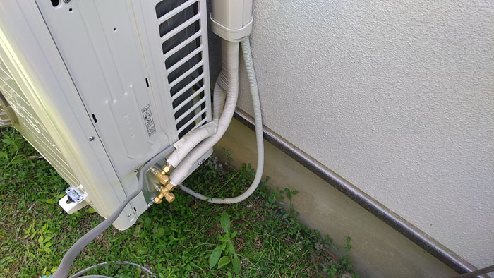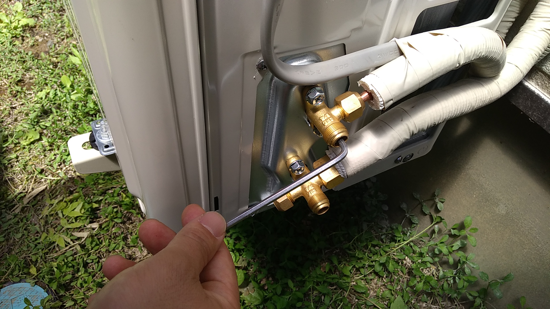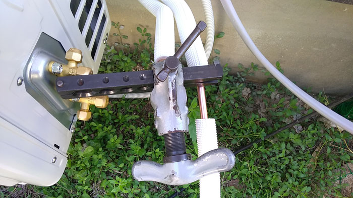 2019年06月25日、エアコン設置工事もいよいよ大詰め。配管を短くし、フレア加工を行います。2分配管のほうは順調に進みましたが、3分配管のほうは事前に強く曲げてしまったために、ナットが入りませんでした。配管を切り詰めてなんとか入るようになりましたが、結構焦りました。後戻りできない作業なので注意が必要です。