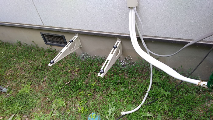 室外機設置の準備。日晴金属 クーラーキャッチャー 壁面用ブラケットタイプ C-BFG-Lを設置します。ドリルで基礎に穴を空け、オールアンカーを打ち込みました。