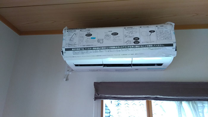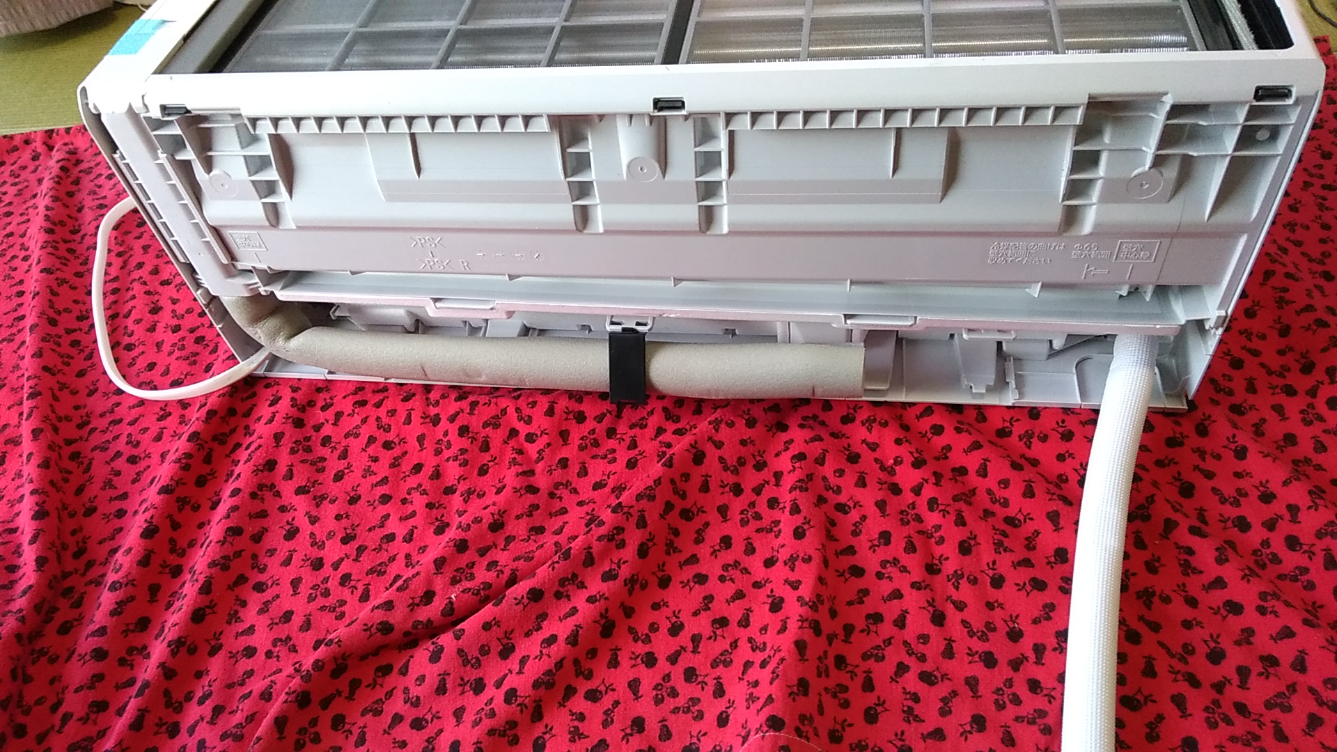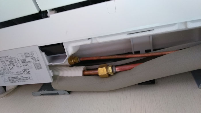 断熱材を巻いてから詰め物を取り除いて室内機の設置完了。