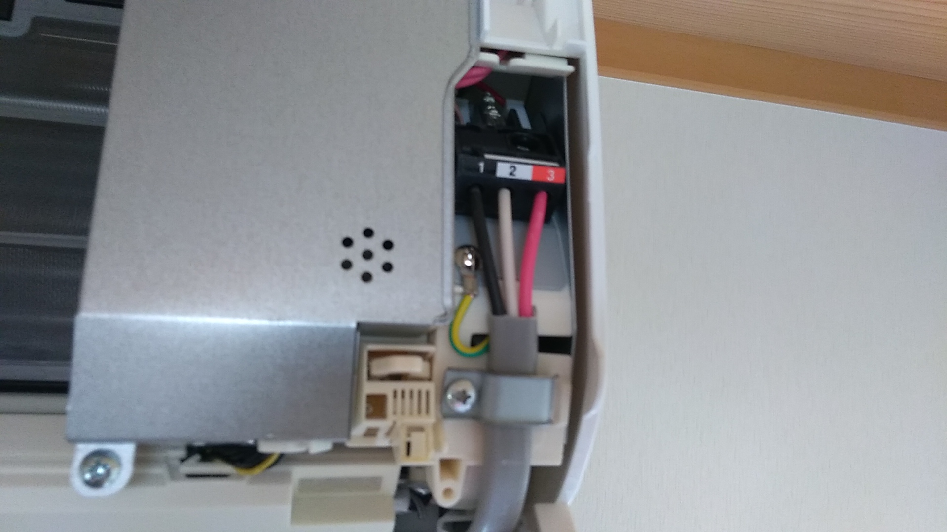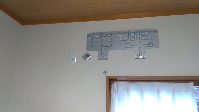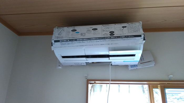 2019年06月18日、室内機の設置。16.5kgあります。「重っ!」と叫んでしまいました。室内機の裏側へ段ボールの詰め物をして室内機を浮かせます。