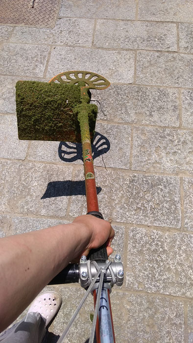 2019年05月04日、今シーズン初めての草刈りをバーハンドルで行ってみました。結果はといいますと…残念ながら思うような草刈りはできませんでした。えー!って感じです。どうもこの刈払機は草刈り中、竿が右回転する傾向があり、それを押さえ込むのに力がいるようなんです。バーハンドル化することで解決するだろうと予想していましたが、どういうわけかツーグリップの時とほとんど変わりません。しかも、バーハンドルはツーグリップハンドルの時よりも腕に掛かる荷重が大きくなりました。これはゴム紐で首から吊るしかない。ということで買ってきました。ホームセンターの自転車コーナーから。