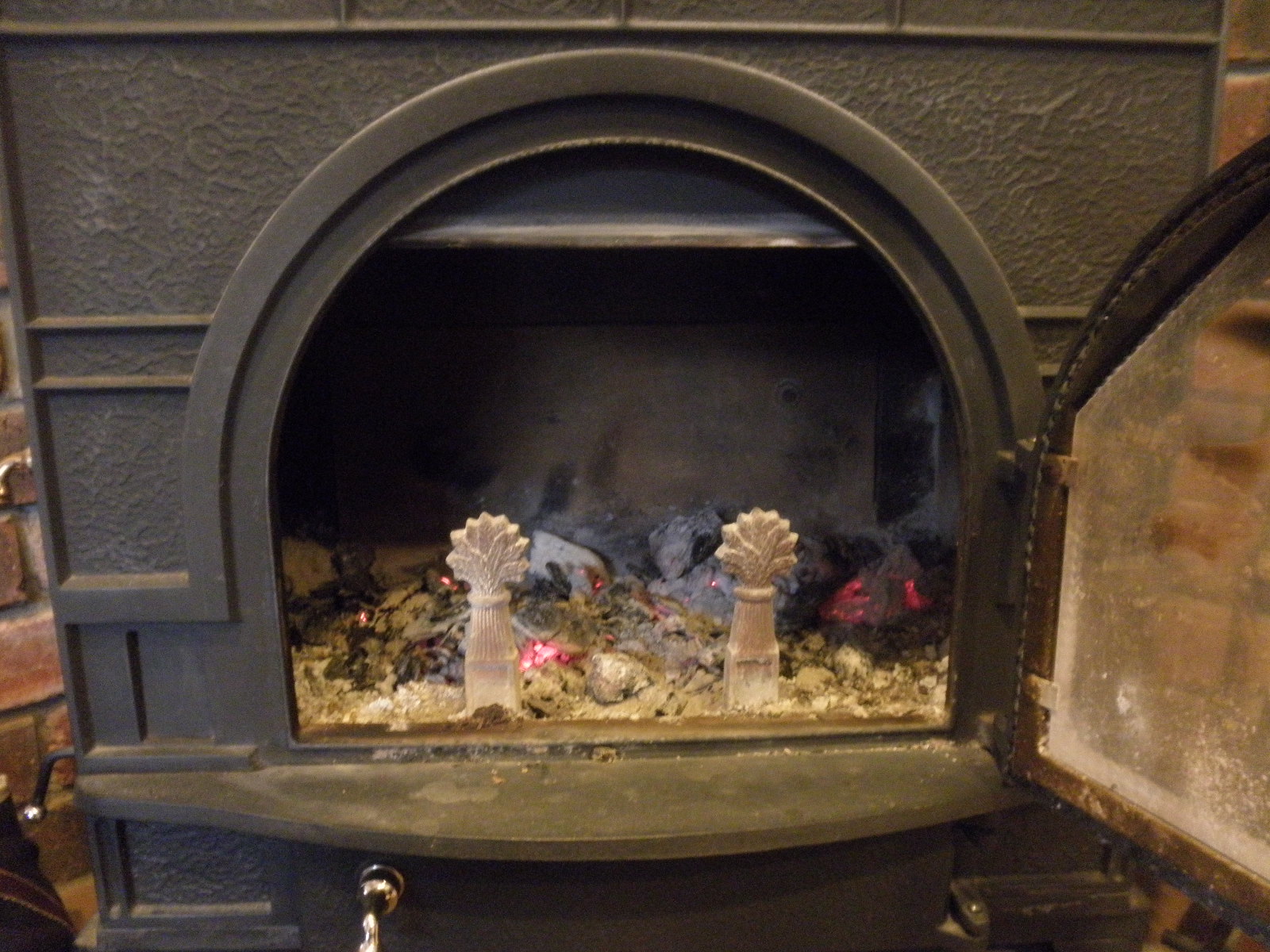 買ってくれば楽ちんです。でも、値段もそこそこしますし、うちの薪ストーブには下の写真のようにアンダイアンと呼ばれる2本の鉄の柱があり、薪がガラスに接触しないような仕組みになっています。