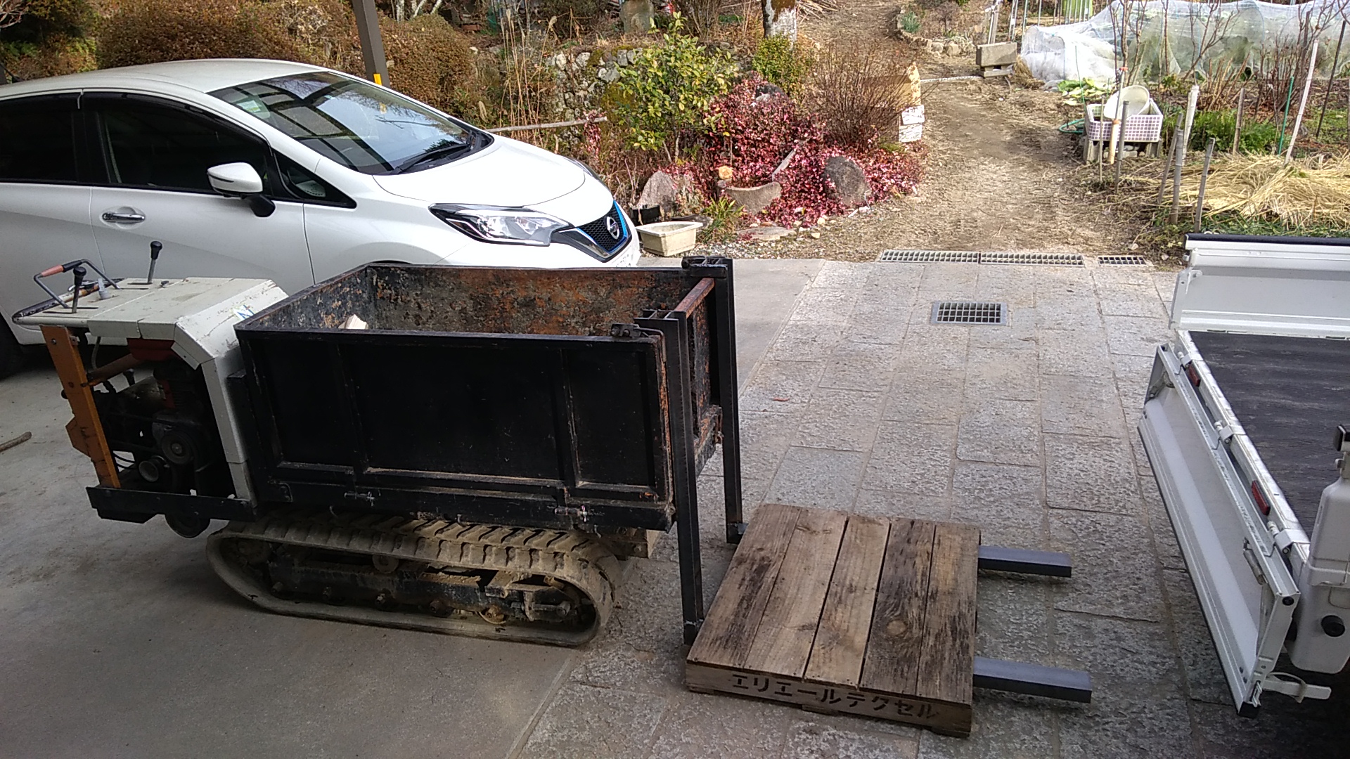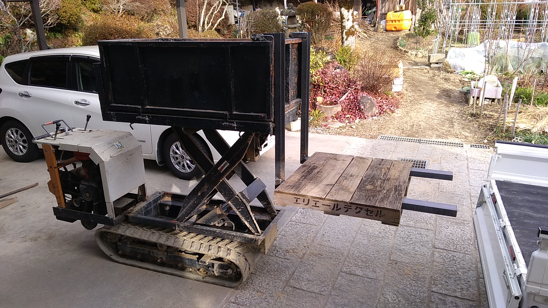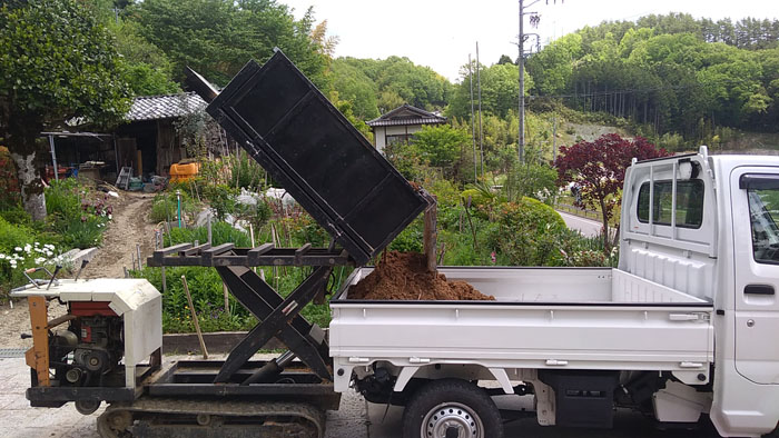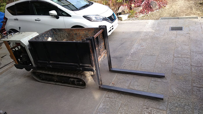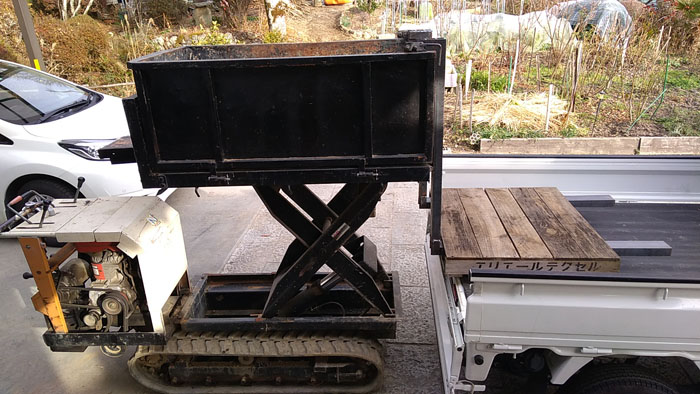 2018年12月16日、「ノザワ クローラーリフトダンプ運搬車 CP-3LLD2」と75X40の溝形鋼 (チャンネル)を使ってフォークリフトを自作しました。この運搬車は土砂運びに最適でして、こんな風に軽トラへ土砂を直接ドサーッと乗せることができます。