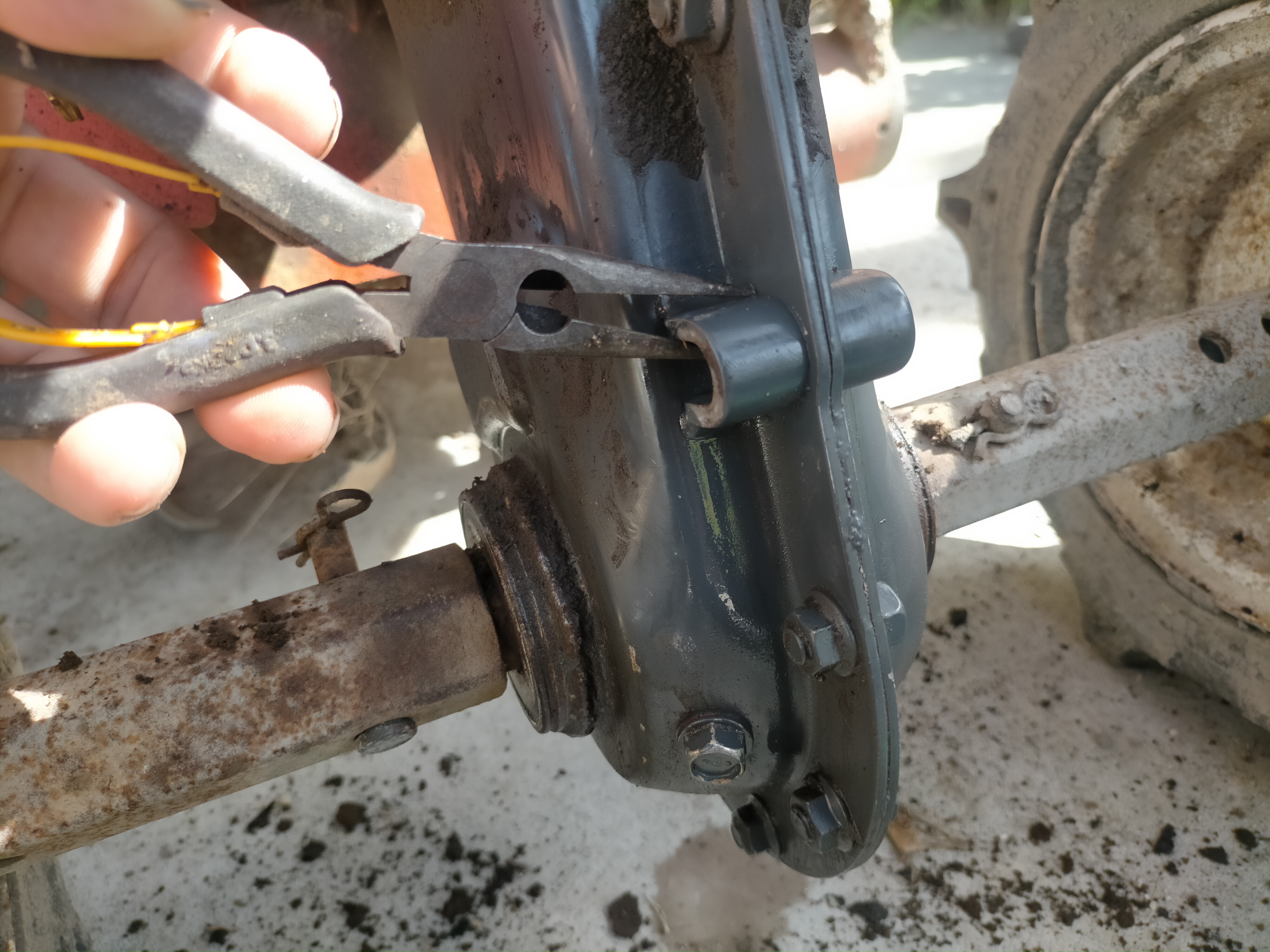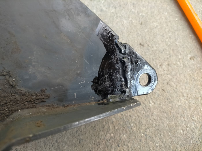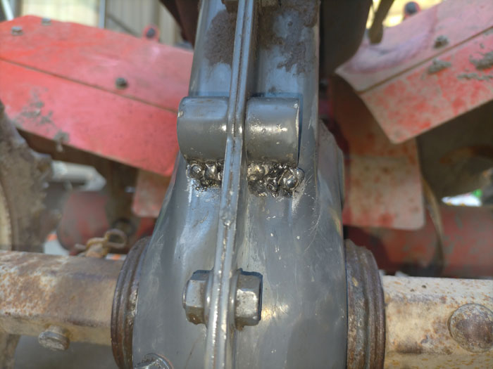 ステーの下側の取り付け部からギアオイルが漏れているようです。ペンチで取り付け部を動かしてみると動きました。溶接が外れているようです。ステーが折れていること、溶接が外れていることから、この耕運機はエンジン部分を強くどこかにぶつけたと想像できます。その結果、溶接が外れ、ケースに穴が開いてギアオイルが漏れたんじゃないかと思います。