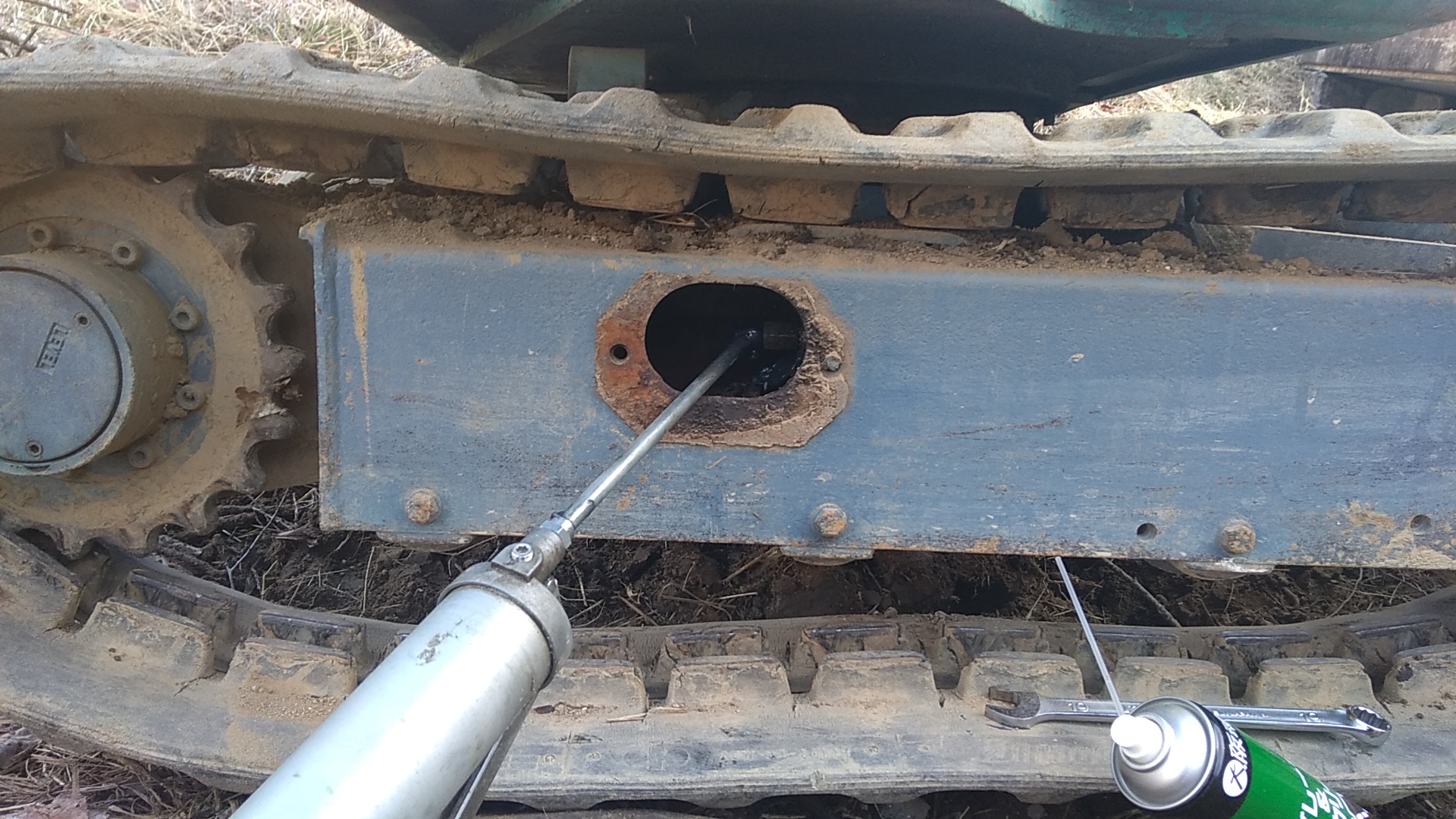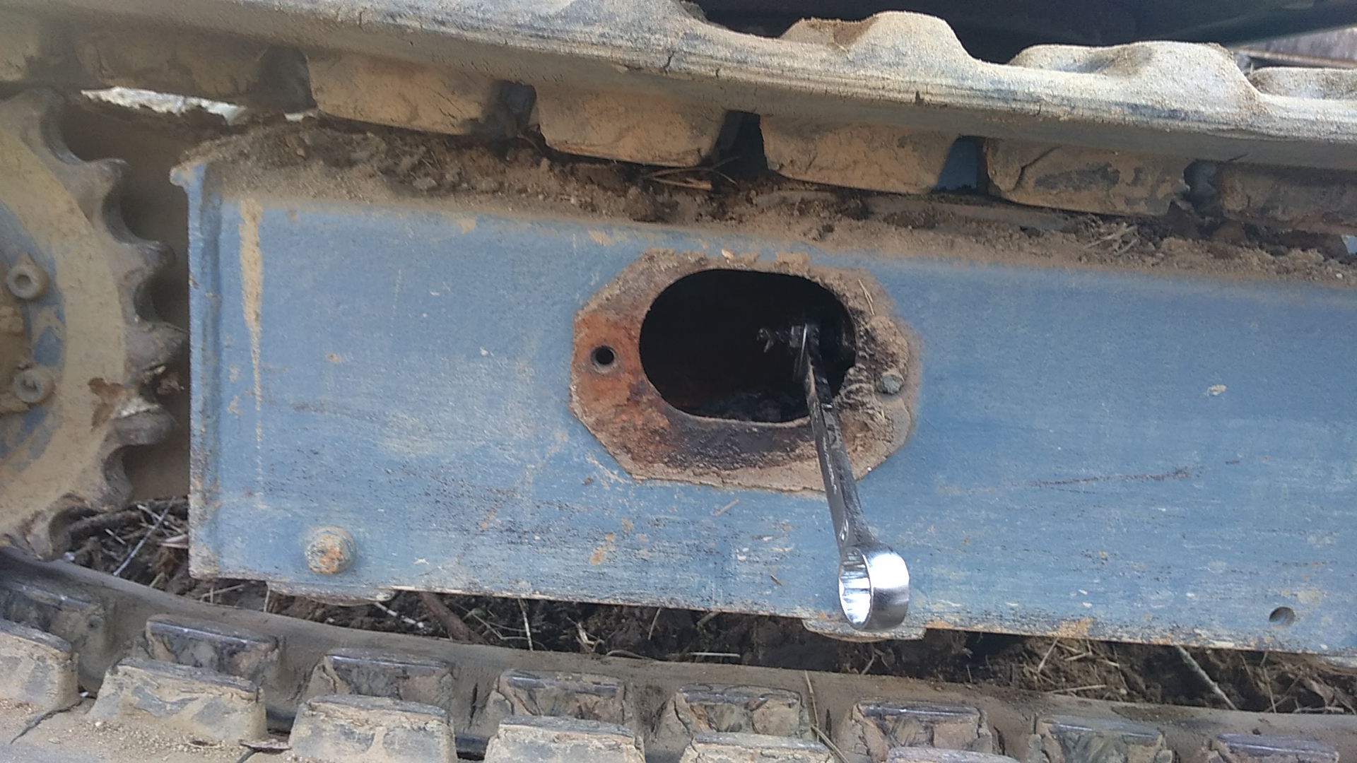 まずは、クローラーの張り調整用のグリスニップルが収まっているカバーを外します。ソケットサイズは14でした。