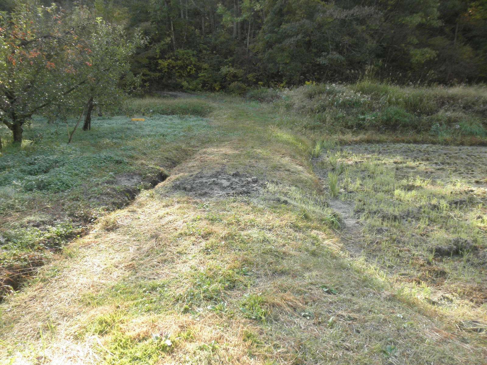 もう何年もやっている舗装工事ですが、2016年12月でいよいよ全長100m以上の舗装された農道が完成しました。長年土の状態で農業機械が通行していたので、真ん中が高くなっています。まずはユンボで土をならします。