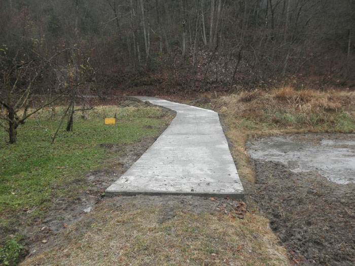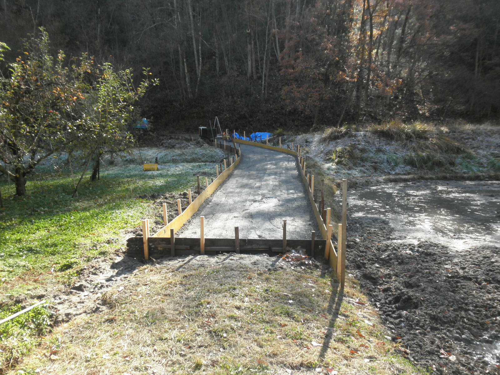 5.5mmのワイヤーメッシュを結束しながらの生コン打設でした。厚み6cm。バイブレーターで締め固めながら、木製の手作りのタンパーで生コンを叩き、コテでならし、6,7m置きにケンタイト(目地板)を入れていきます。そうして最後にホウキを使って滑り止めにホウキ目仕上げ。毎度、総勢4名。ちょっと人足が足りないです。でも、きれいに仕上がりました。