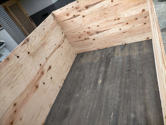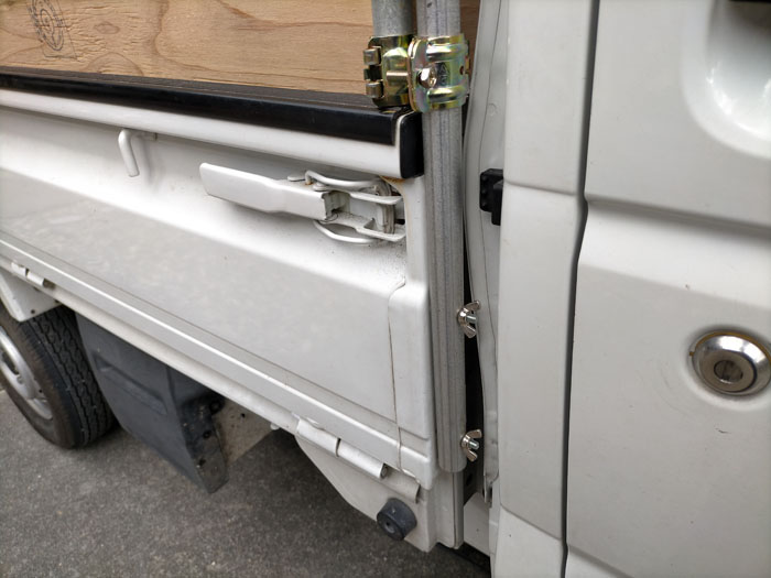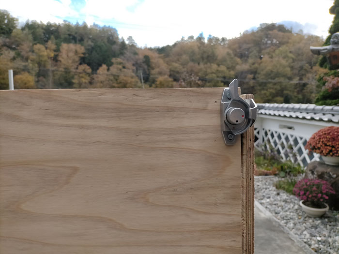 こんな風にサイドのコンパネは固定しました。16A用のサドルバンドでパイプをコンパネに固定しました。