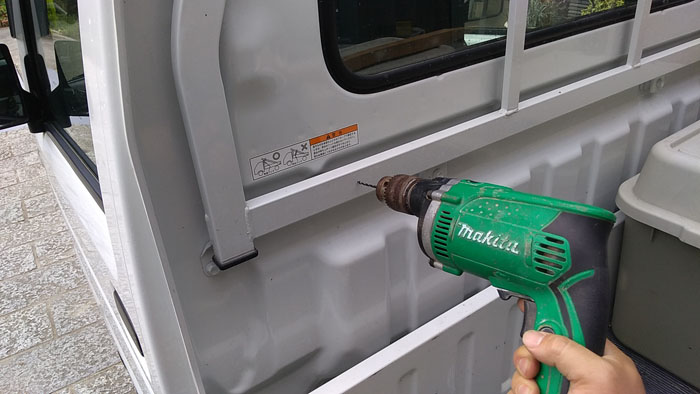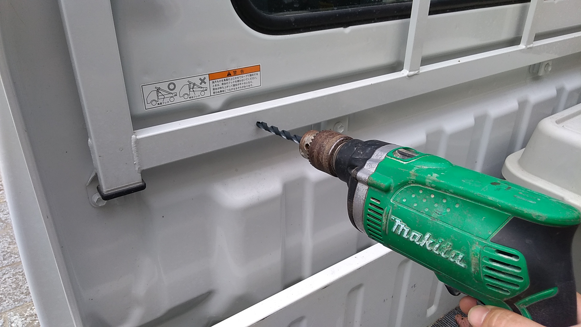 次。軽トラの鳥居に穴を開けていきます。「ちょっとナッター」指定の穴径は9.1mmです。ステップドリルも持っていますがもし行き過ぎた場合大変なことになるのでドリルビットを新たに購入しました。もちろんまずは細い径から開けていきます。