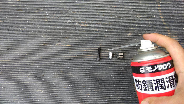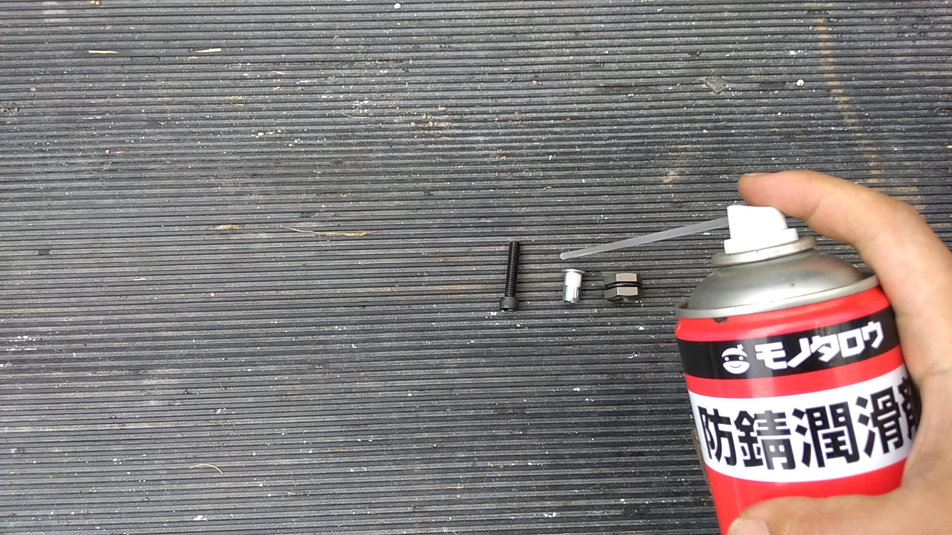 さて、もっとも重要な作業。ナットの取り付けです。マンドレルという部品に潤滑油を吹きかけます。