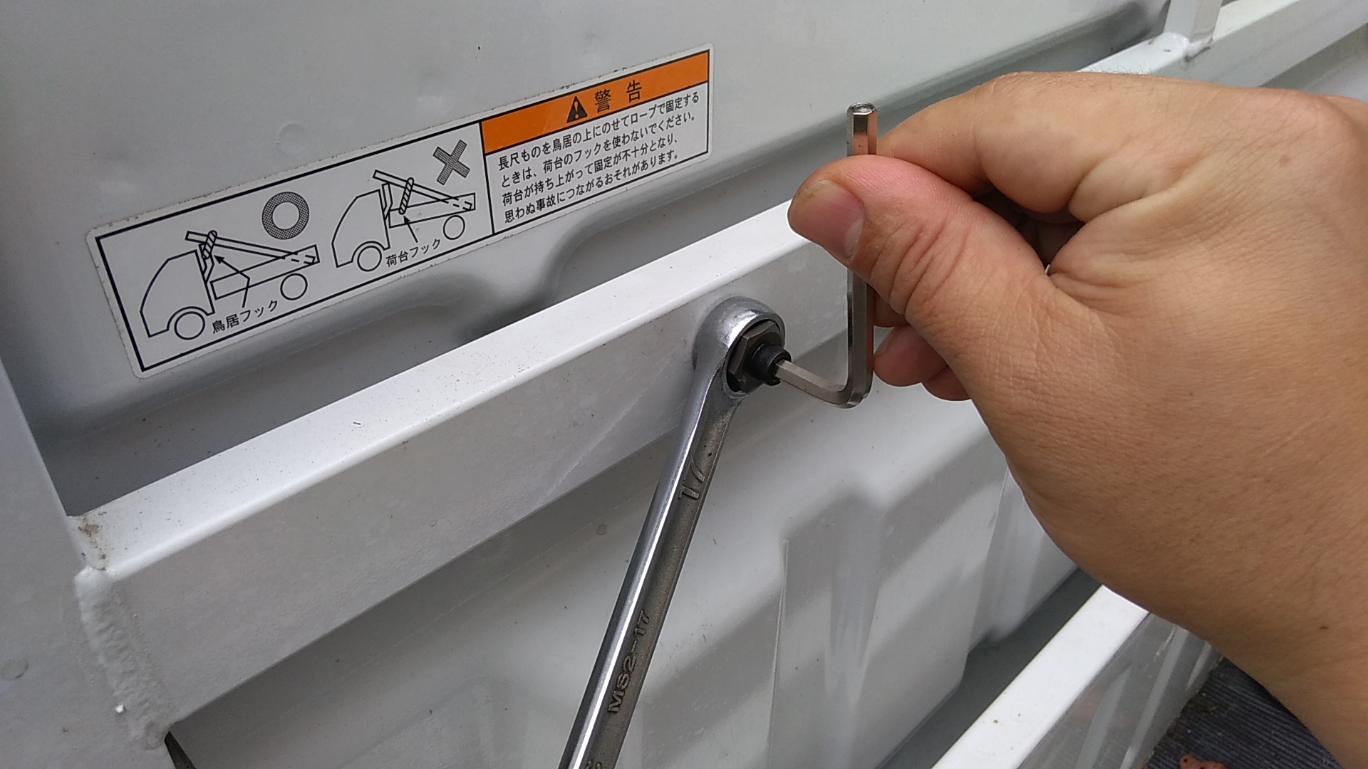 そして、17mmのメガネレンチでナッター本体を固定しながら、マンドレルへ六角棒レンチの5mmを入れて指定の回数回します。今回の穴は2mm厚ぐらいだったので2周回しました。
