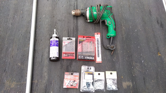 道具たちの紹介。左上から農業用直径25.4mmパイプ2m、ドリル、ドリルオイル、鉄工用ドリルビットセット、鉄工用ドリルビット9mm、ちょっとナッターM6用、蝶ボルトM6 40mm、スプリングワッシャーM6、ワッシャーM6です。