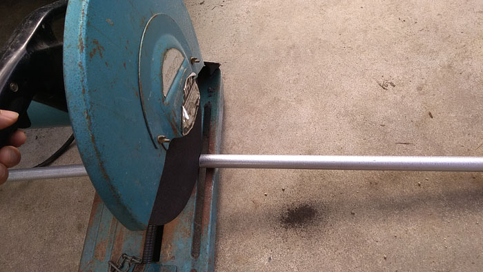 作業開始!まずは、パイプの切断から。パイプを慎重に鳥居に当てて大体20cm程度鳥居から出るように。かつ普段は反対向きに取り付けて収納できるように考えて長さを72cmに決定しました。高速切断機で切っていきます。持ってない方はディスクグラインダーや鉄ノコでいいと思います。