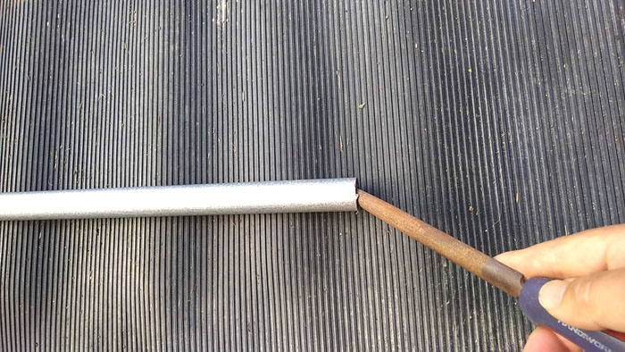 パイプに穴を開けます。この位置も実際にパイプを当ててみて慎重に決めます。決まったら、マジックで印を書いて、細い径のドリルビットから穴を空けていきます。