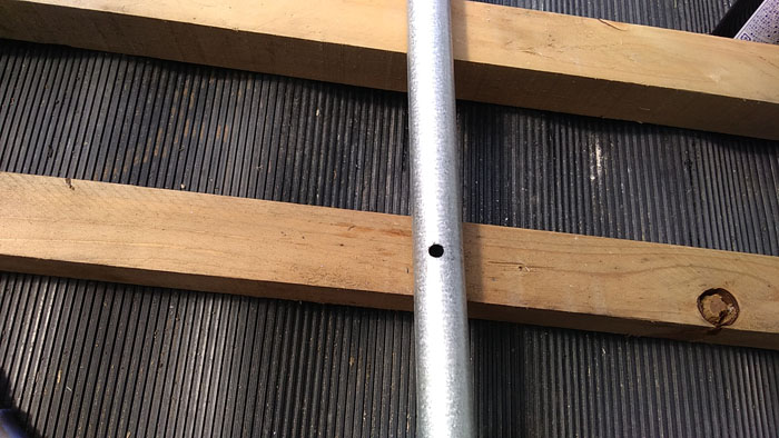 が、問題発生。収納時仕様で単管を乗せると単管がツノと干渉してしまいます。