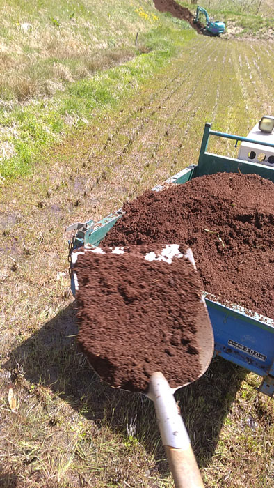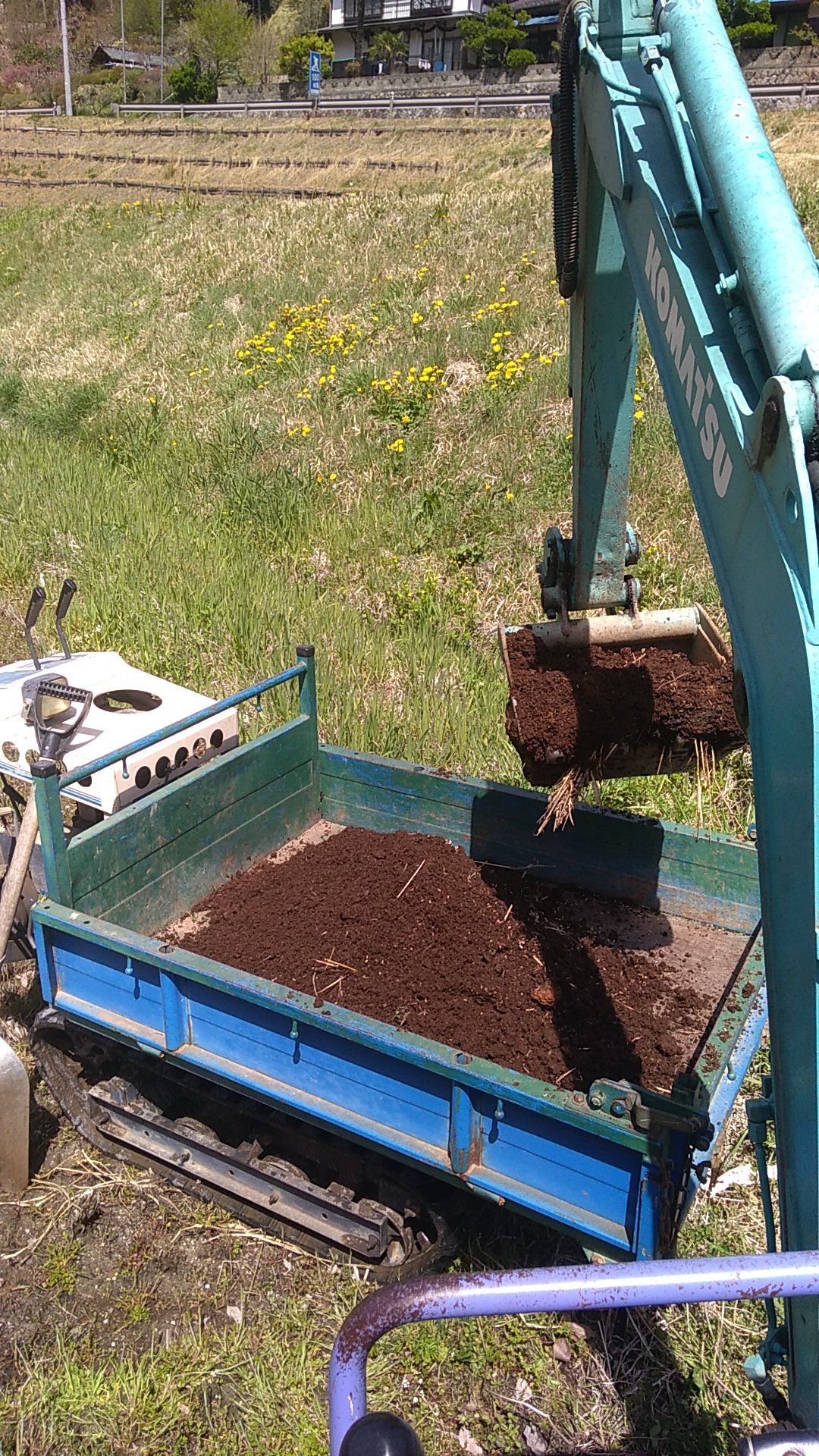 どんな作業かといいますと、ユンボでよっこらしょと堆肥をすくって、運搬車へ乗せて。