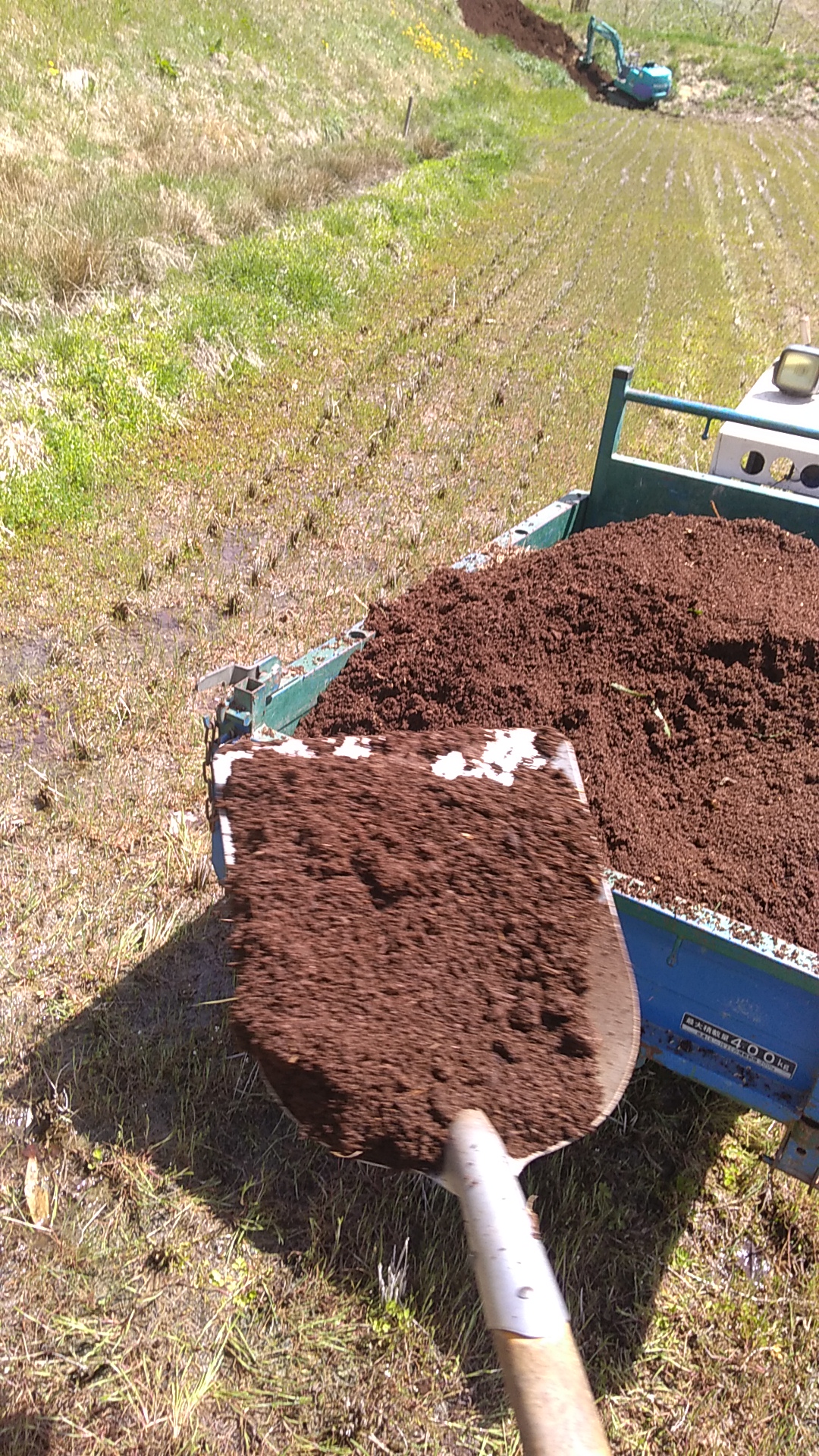 明日は午後から雨らしいので、時間がありません。堆肥がビシャビシャになったら、まきづらいので困ります。