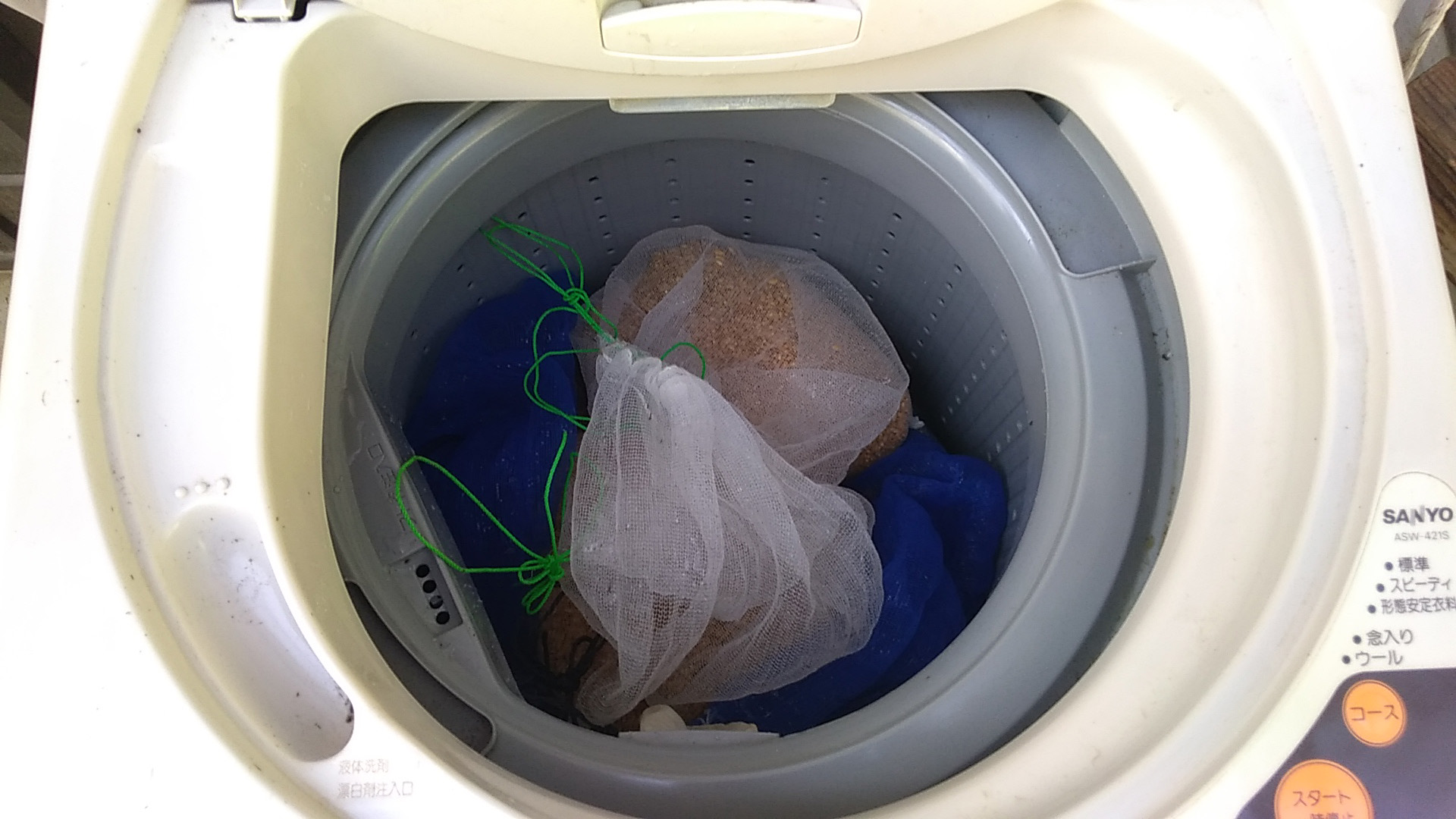 種籾をまきやすくするために洗濯機で脱水します。最初の頃はこんなことして大丈夫だろうか…と緊張しながらやってました。標準モードで脱水して全然問題ありません。