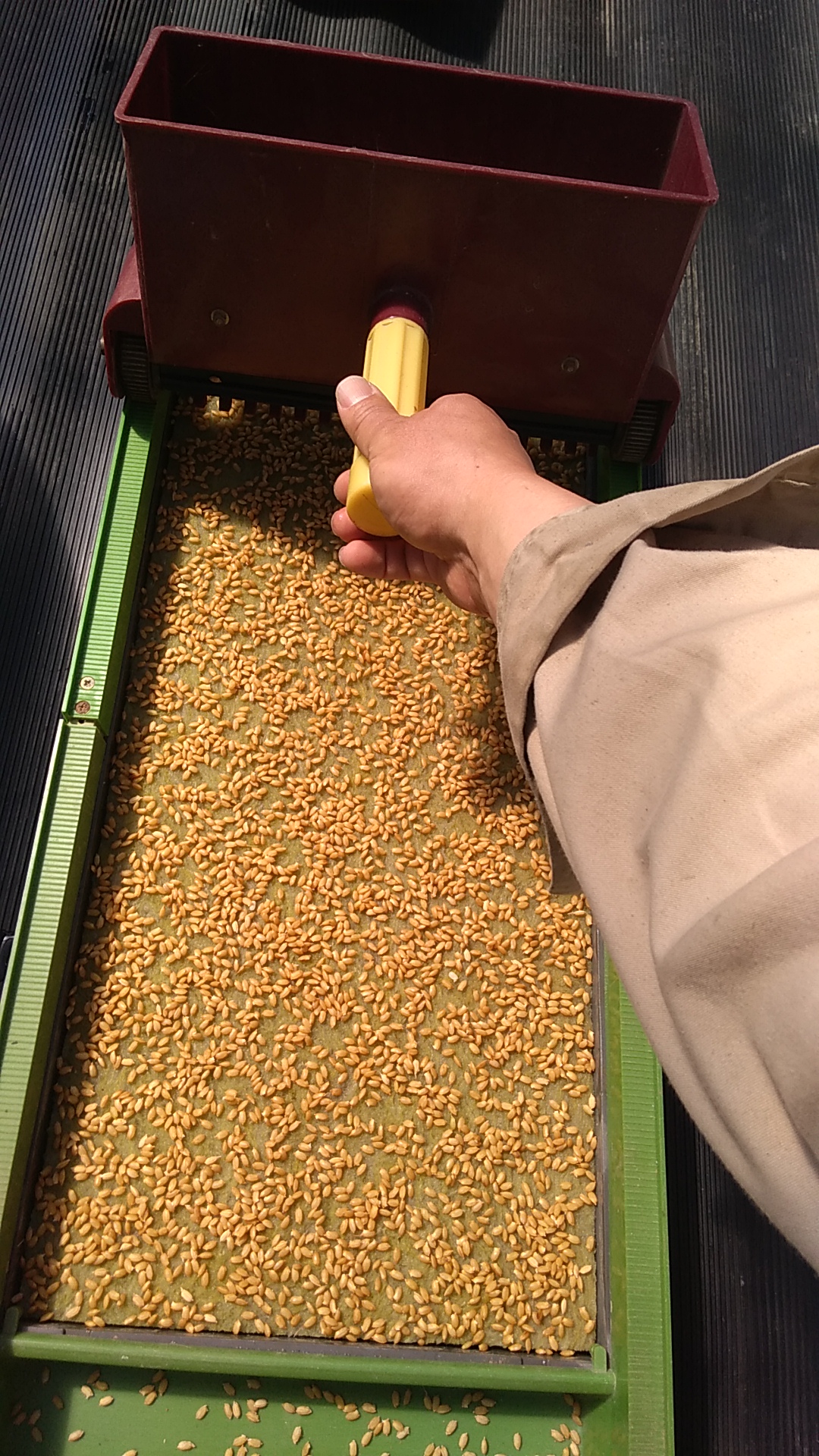 「みくに式種まき機」なるものを使って種籾をまいていきます。種籾を容器に入れてレールの上をスライドさせるだけで種がまける優れものです。これも昔にヤフオクで調達しました。