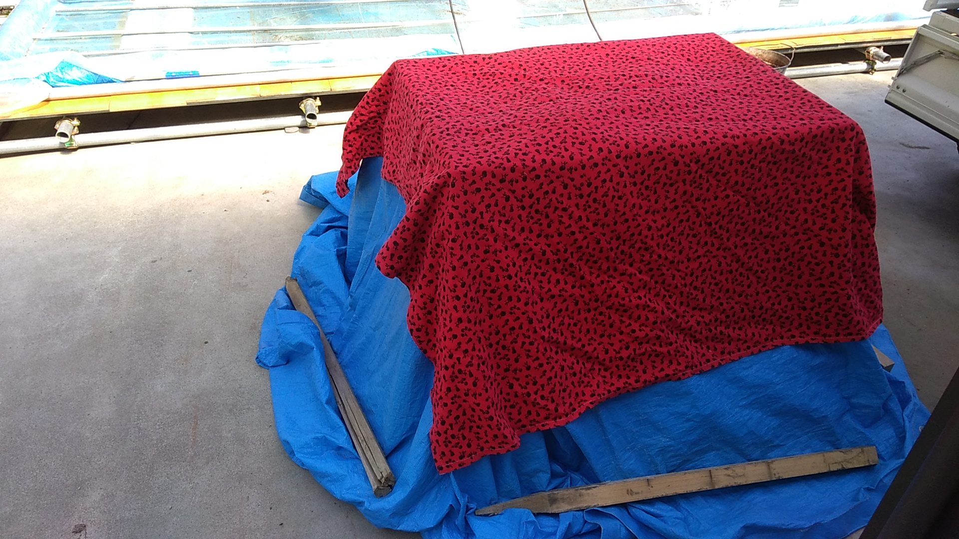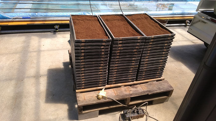 パレットの下に電熱線を設置し、サーモスタットの設定を25度に設定しました。ブルーシートなどで熱が逃げないように保温して、出芽作業に入ります。やれやれです。