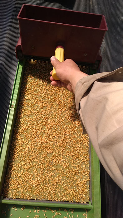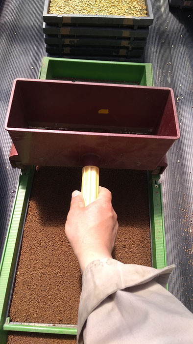 種まきが終わったら、今度は覆土をします。「みくに式種まき機」が2つあるので片方を覆土用に使っています。