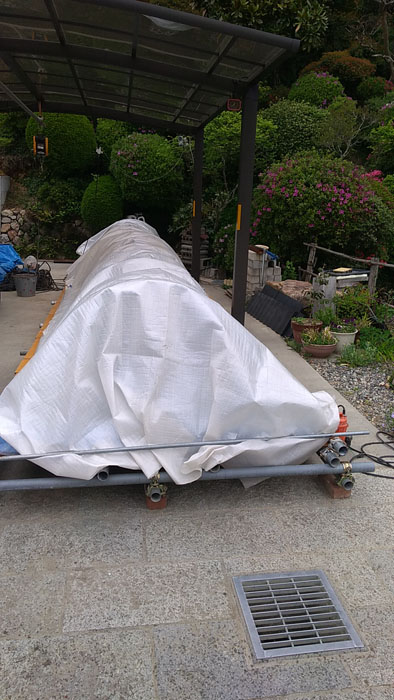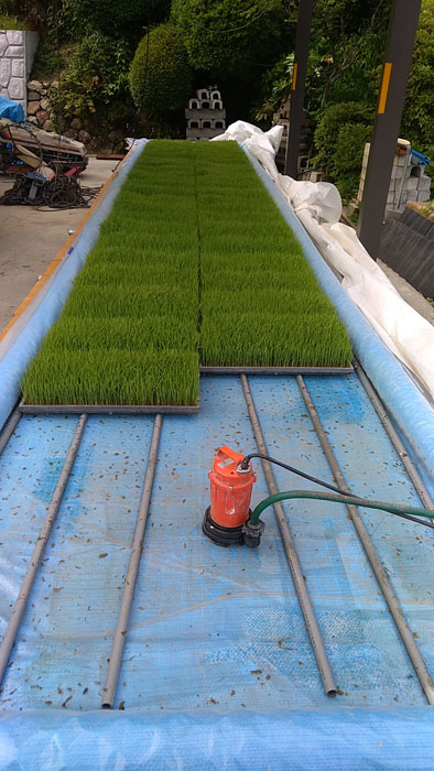 2018年05月15日、明日、代掻きを行います。ということは田植えも近いのです。ポンプでプールの水を抜きました。ここで塩ビ管を苗の下に置いたことが威力を発揮します。