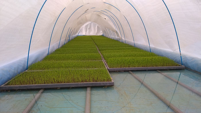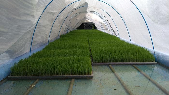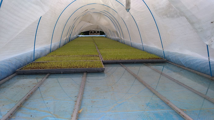 2018年04月24日、出芽した苗をプールに並べました。出芽が不揃いな苗はまだ保温しています。なかなか完璧とはいきません。