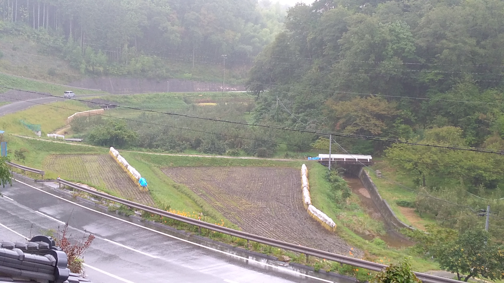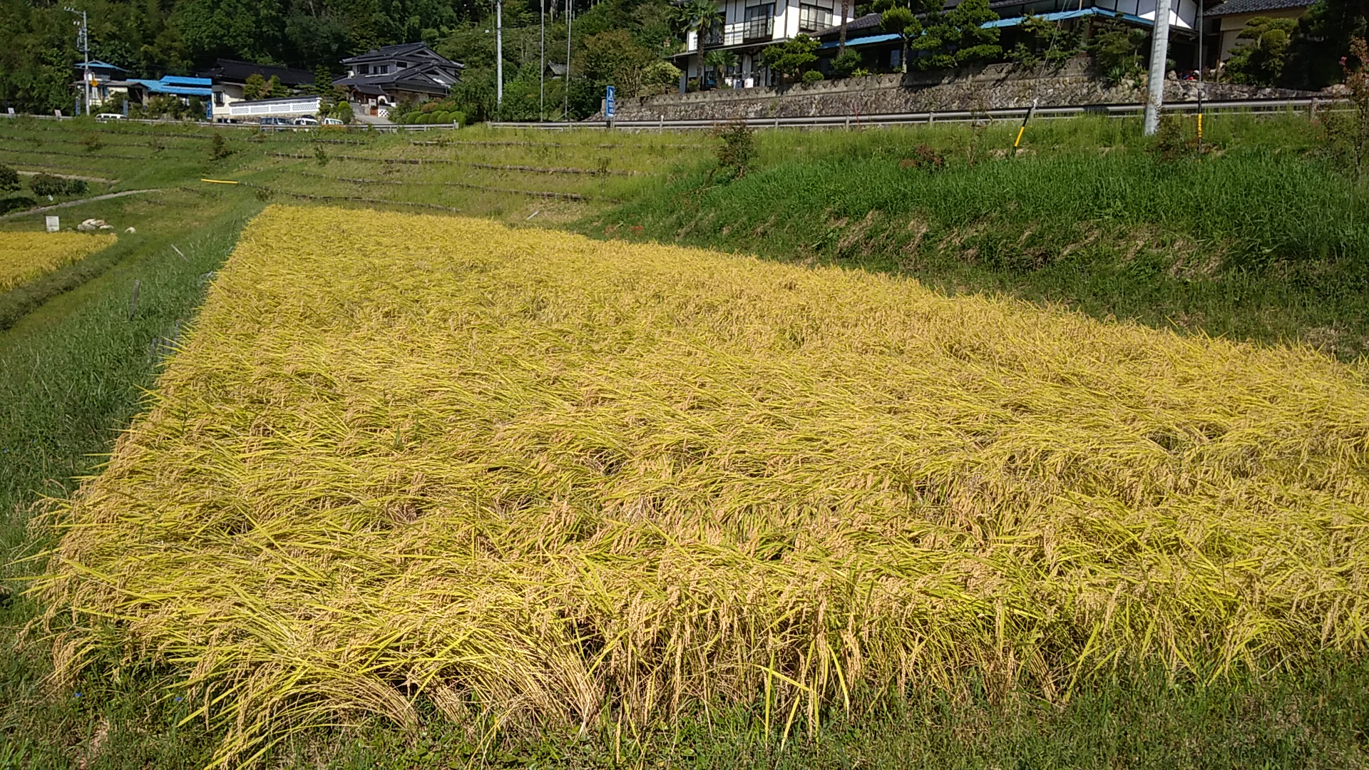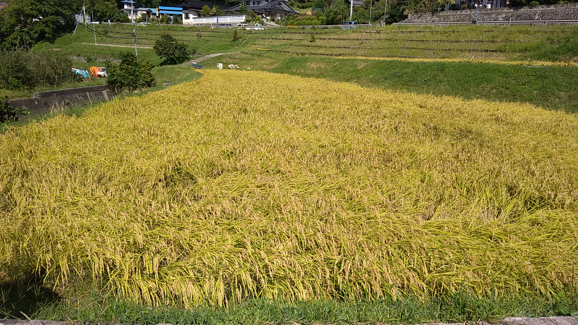 下の田のアップ写真です。こちらも倒れていますが、向きが刈り手側に向いてないのでまだマシです。この程度の倒れ方なら稲の上を機械が滑る心配はなさそうです。こちらは堆肥と化学肥料を主体で育てました。一概には言えませんが、今回はどちらかというと上の田のほうができが良さそうです。