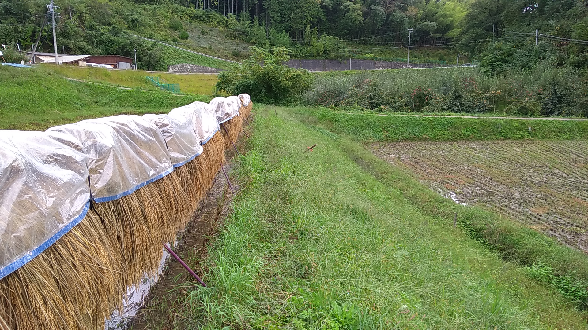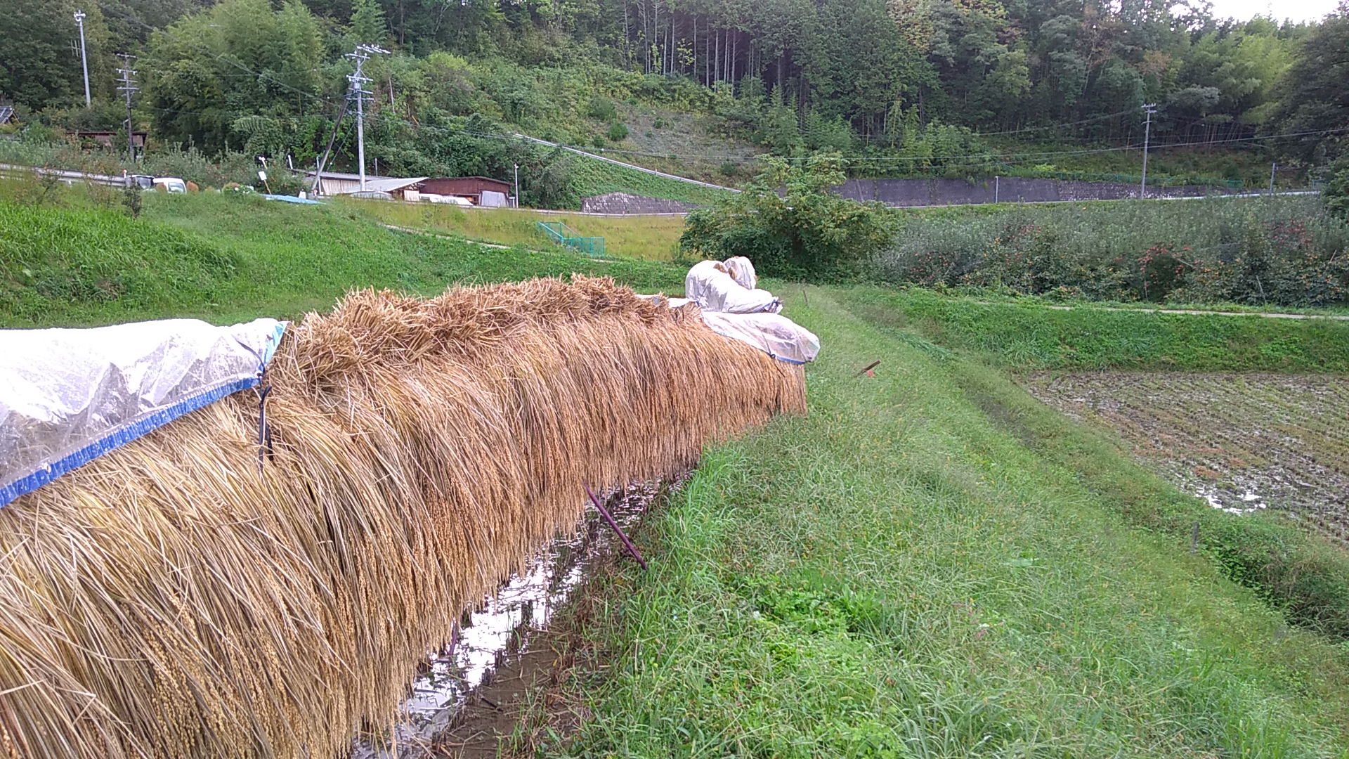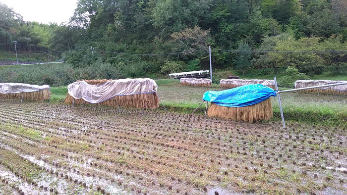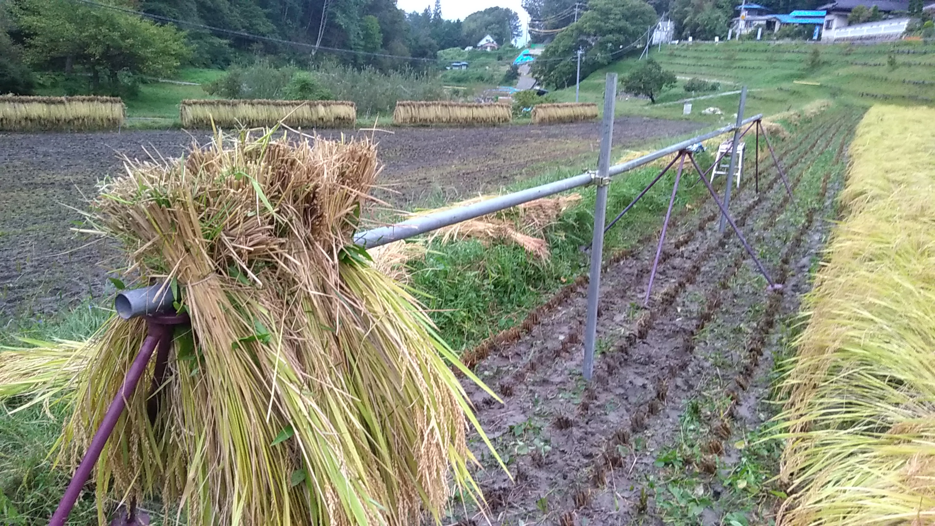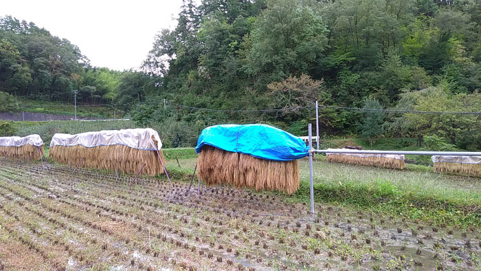 バインダーで稲を刈って、運搬車で運んで稲ハザへ稲を掛ける、という地味な作業を2日間やりました。体中あちこち痛くなりました。コンバインと違って、稲ハザ方式は相当疲れます。最終日は雨が降ってくるし、正直、たくさん写真撮る余裕ありませんでした。