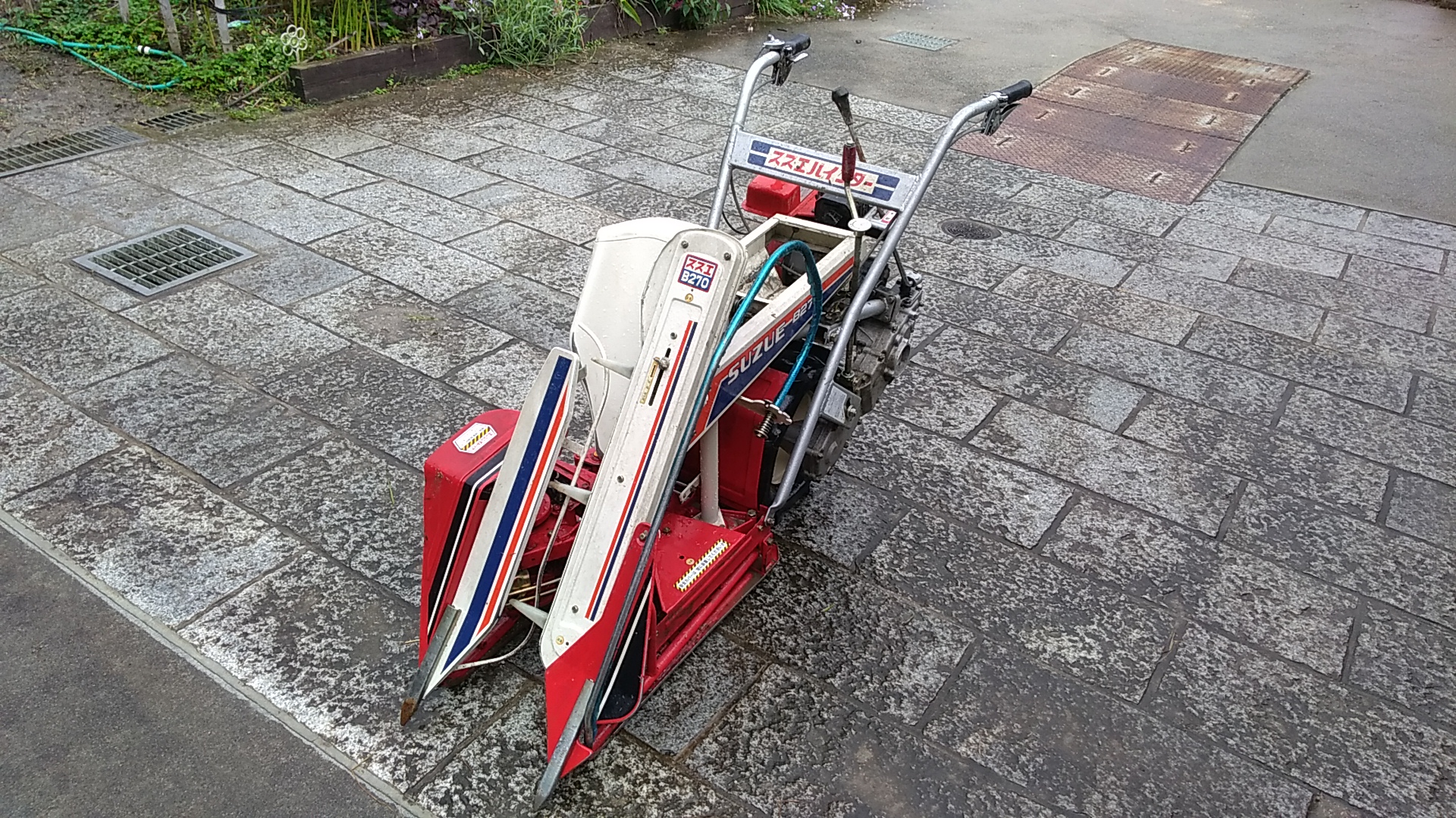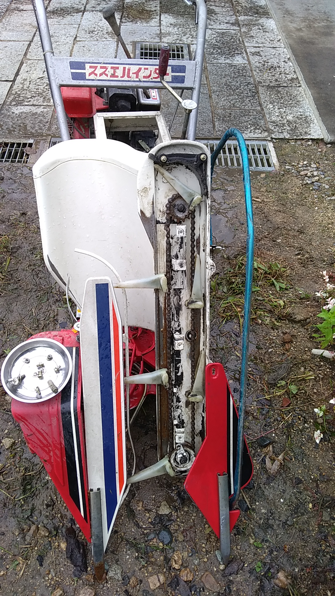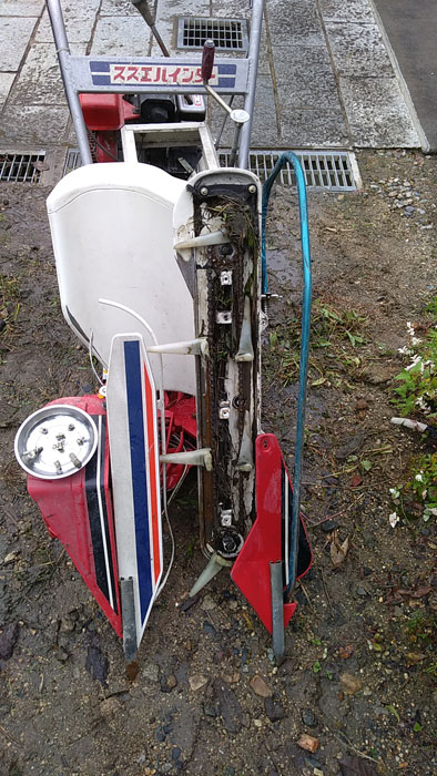 さあ、稲刈りの準備です。まずは、バインダー。これがなくては始まりません。稲を刈ってある程度貯まると稲束として縛って排出してくれます。ちなみにこれは今年5千円でヤフオクで落札したものです。ヤフオク様々です。しっかりと注油します。