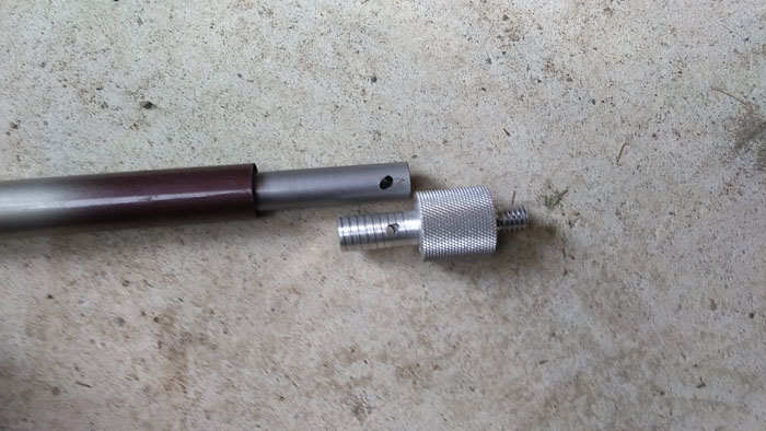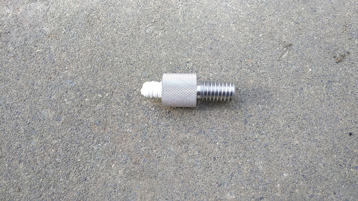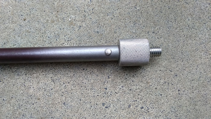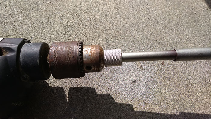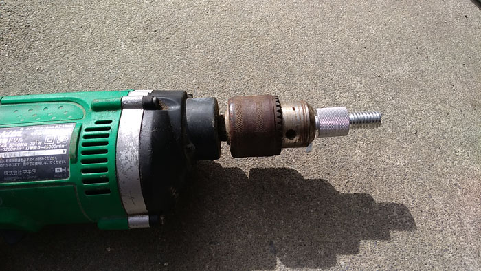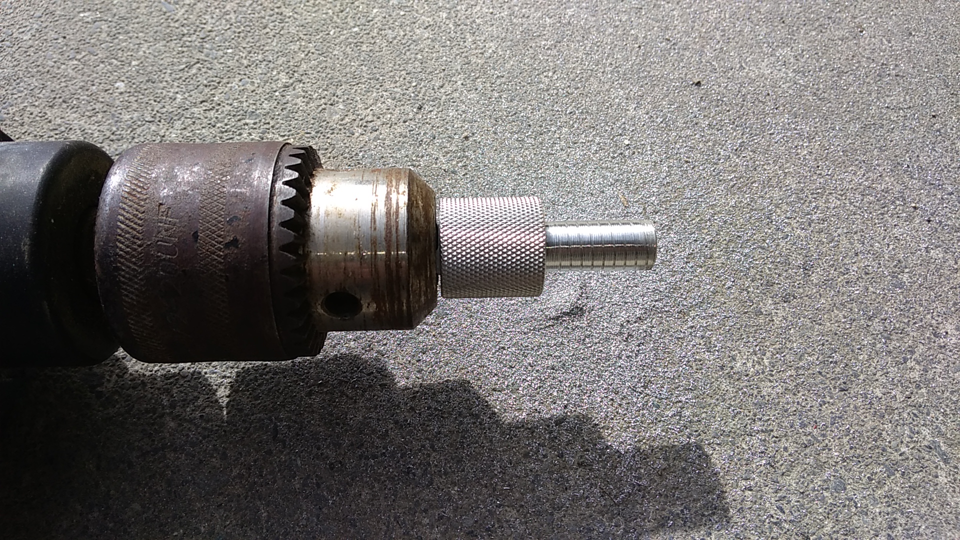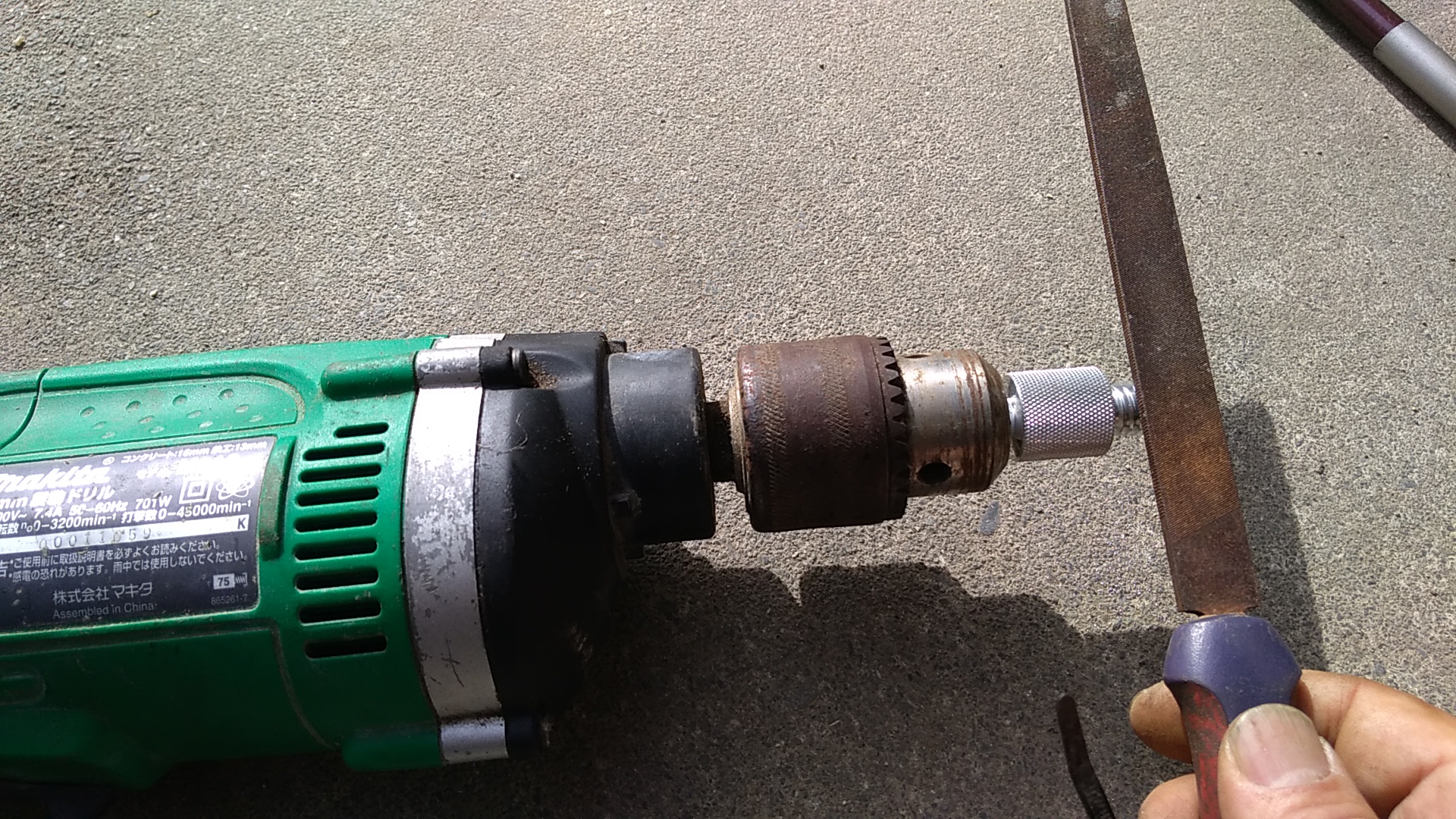 現状では金具のほうが大きく竿の穴に収まりません。旋盤などという高級なものはうちにはないので、ドリルで金具を回しながら削っていきます。その下準備として、ネジに傷がつかないようにシールテープを10周くらい巻いておきました。