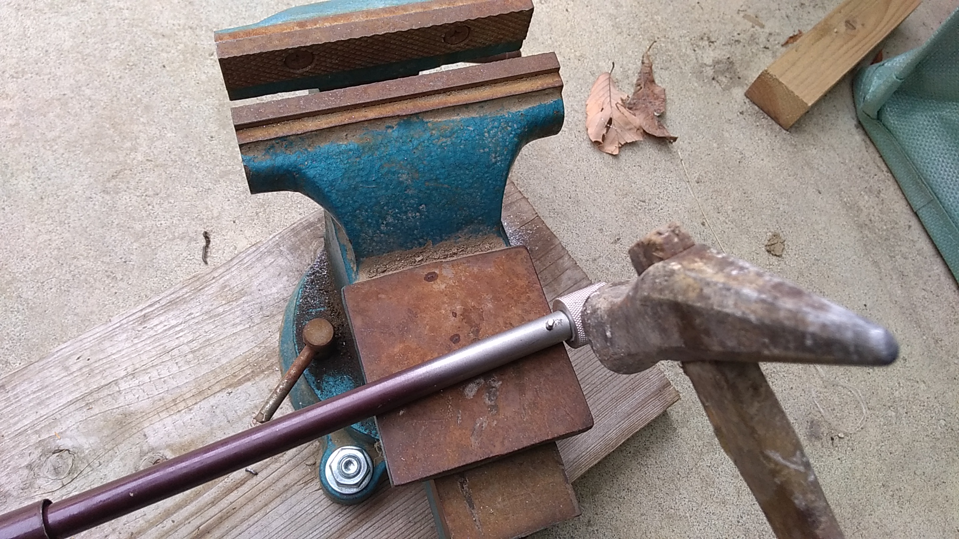 丸リベットの先端を5mmくらい出るところまでディスクグラインダーで削って寸法を出したら、金槌で慎重に叩きます。あたかも鍛金のように。