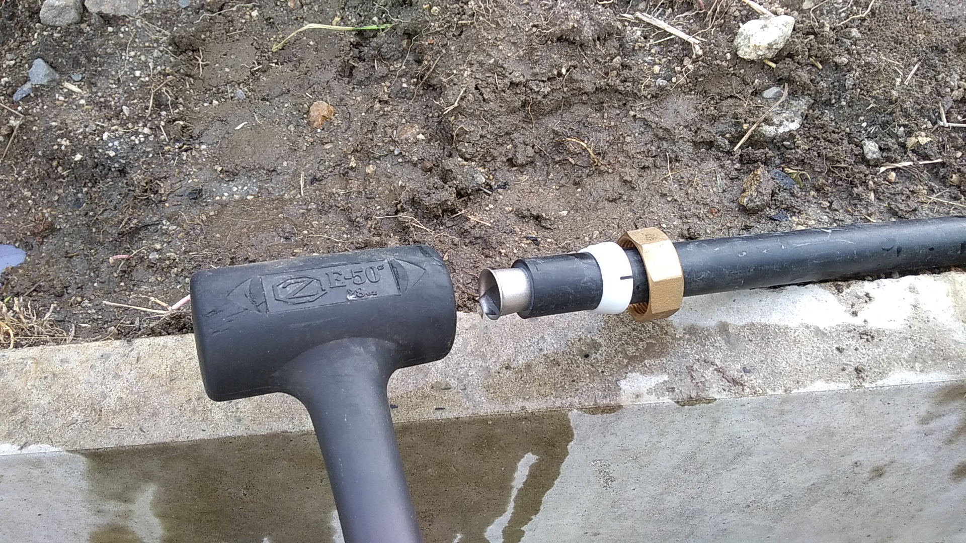 この順番でポリエチレンパイプに取り付け、打ち込みコアを樹脂製ハンマーでしっかり打ち込みます。