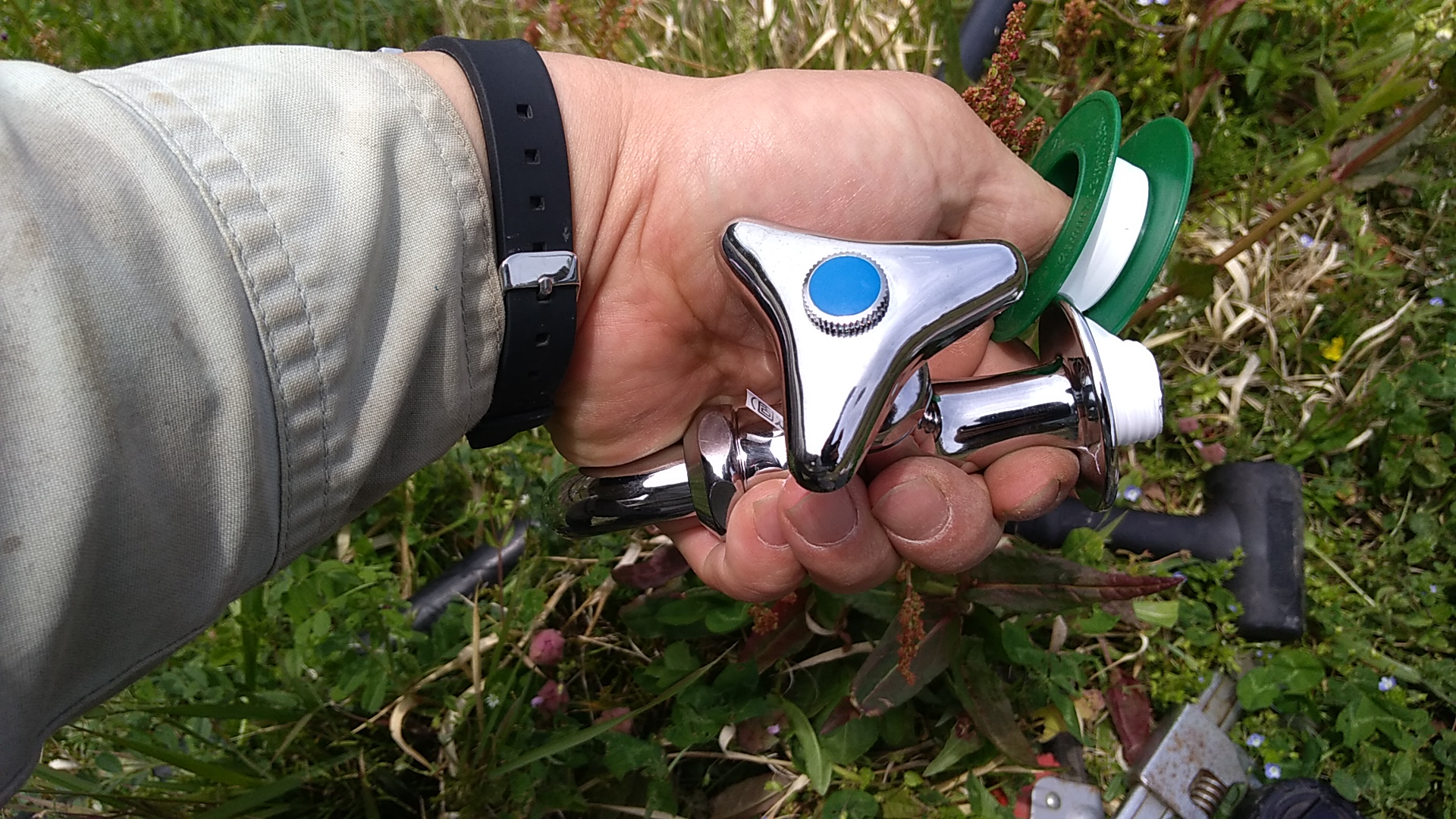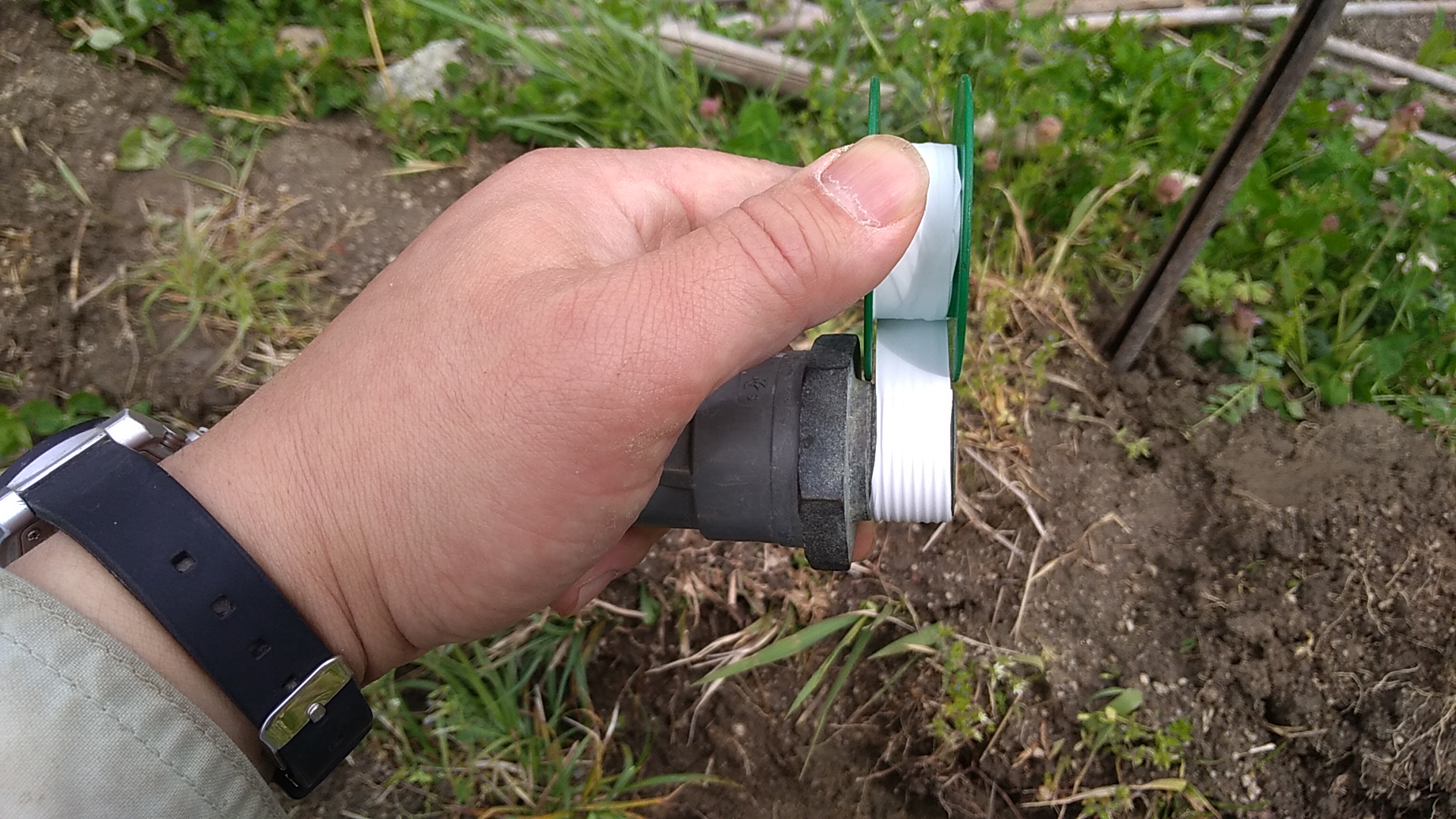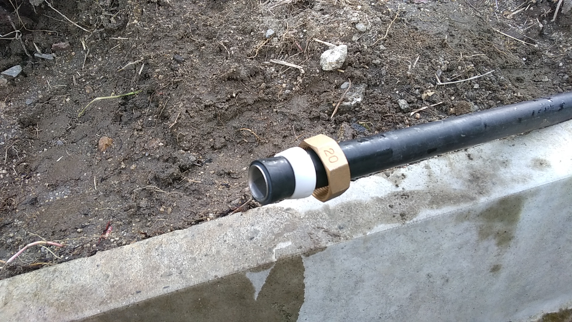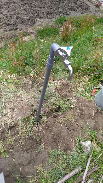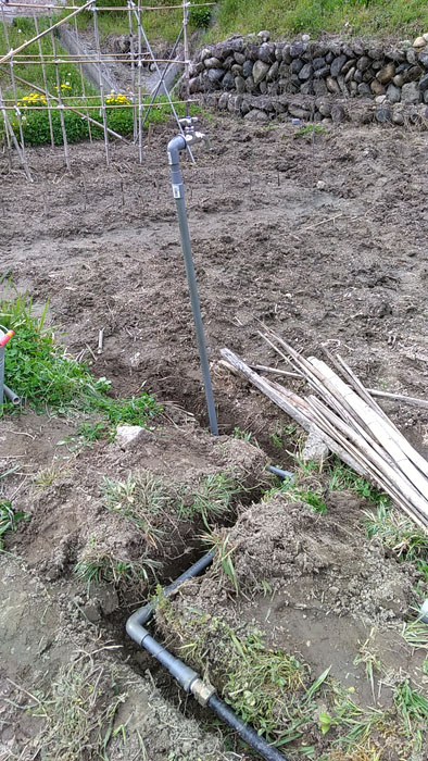 とうとう蛇口がつきました!と、ここで問題発生。塩ビパイプを立ち上げたこの位置は一輪車の通り道でした。場所を変えなくてはなりません。