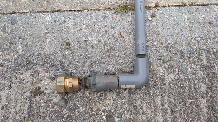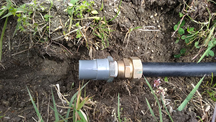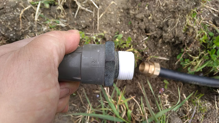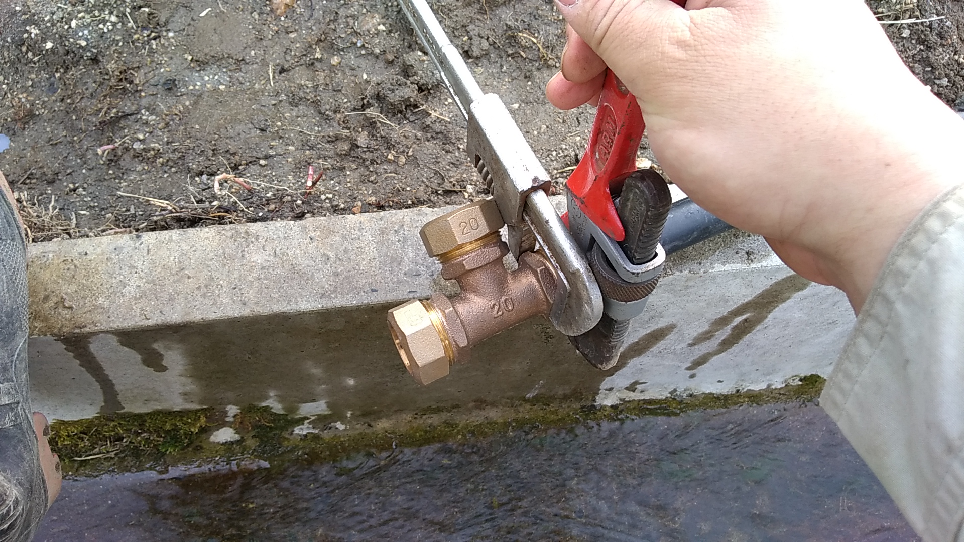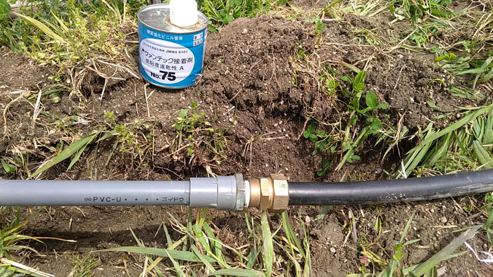 パイプレンチを使ってしっかりと接続します。これでポリエチレンパイプから塩ビパイプ(VP管)に変換できます。