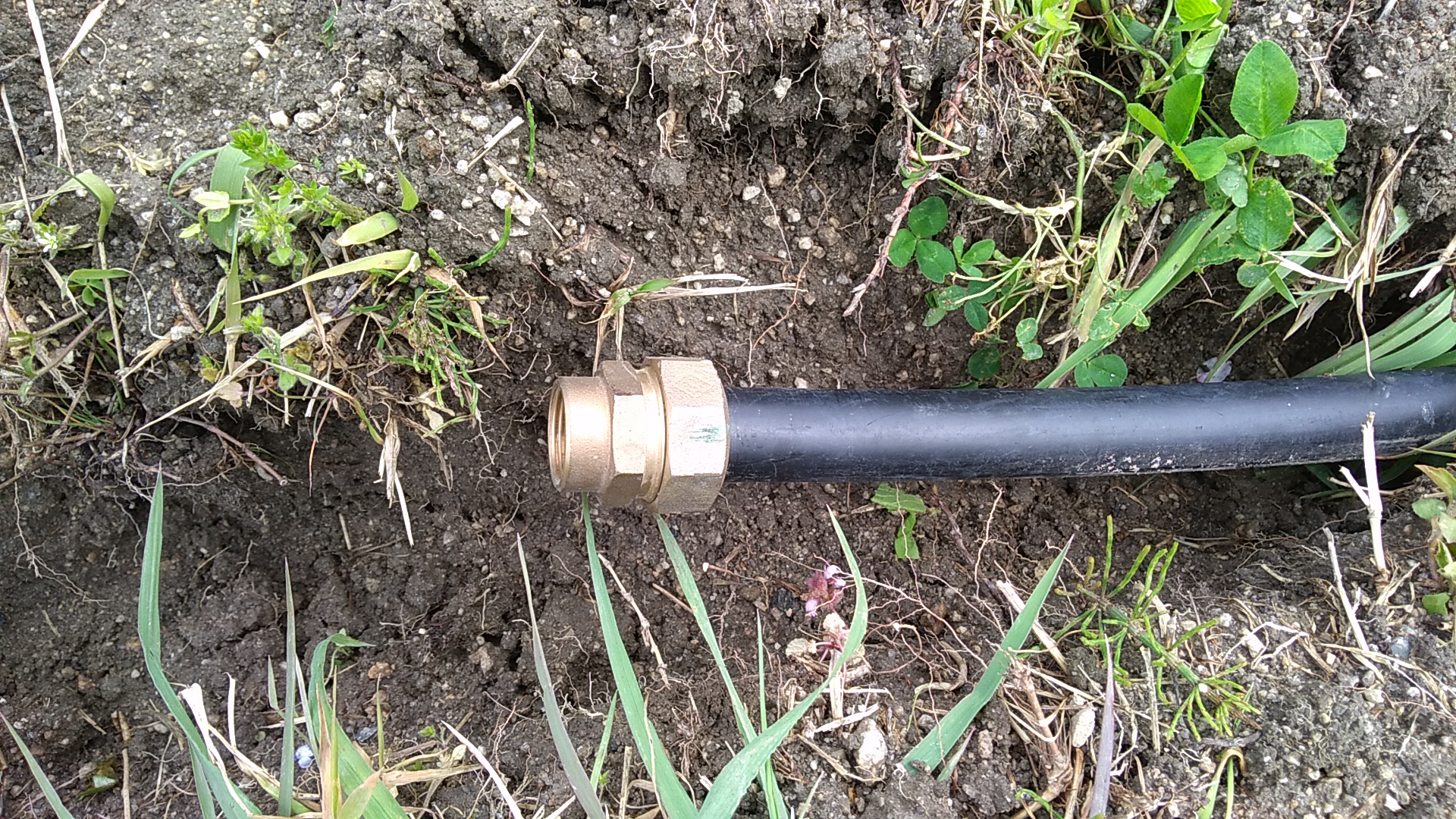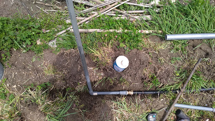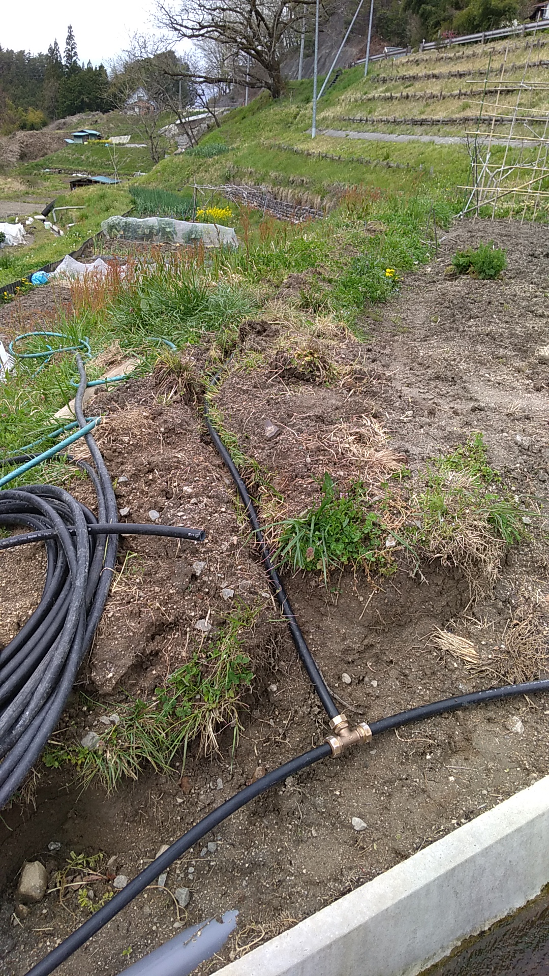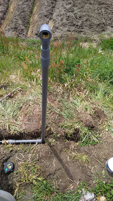 2020年04月19日、貯水池から引いてきたポリエチレンパイプを畑に分岐する工事を開始しました。ポリエチレンパイプのサイズは20mm(20A)。結構な落差で圧がかかるので水道用二層管。右から出ているパイプが本線で、左へと流れています。ただし、これから紹介する設備は冬期間は使えません。凍る前に水抜きをしています。ですので非常に浅い所にパイプを埋めています。