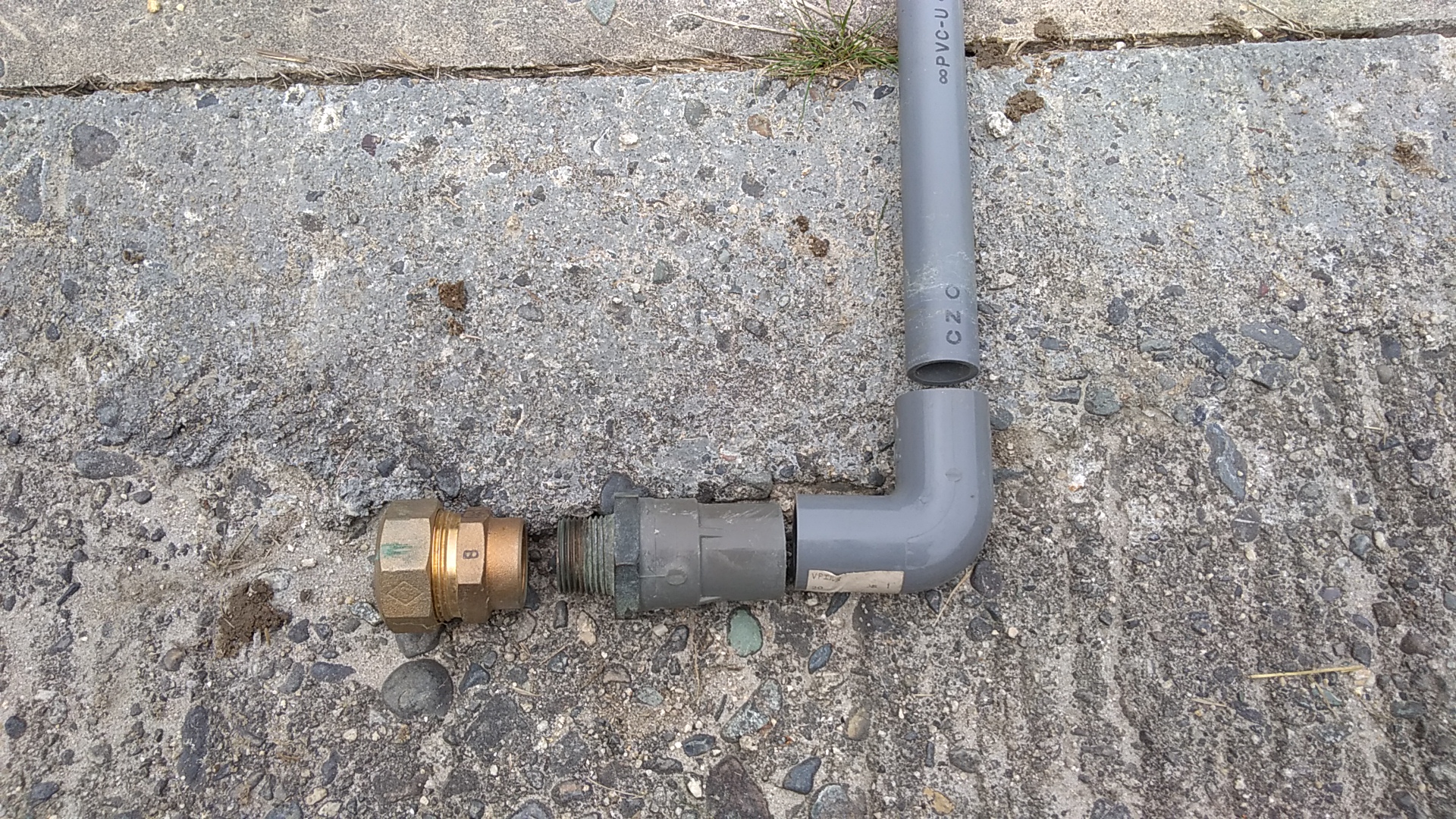 この順番で接続していきます。左から砲金製ポリエチレンパイプ継手のめねじ付ソケット、TSバルブソケット20(インサート付)、エルボ、VP20の塩ビパイプです。