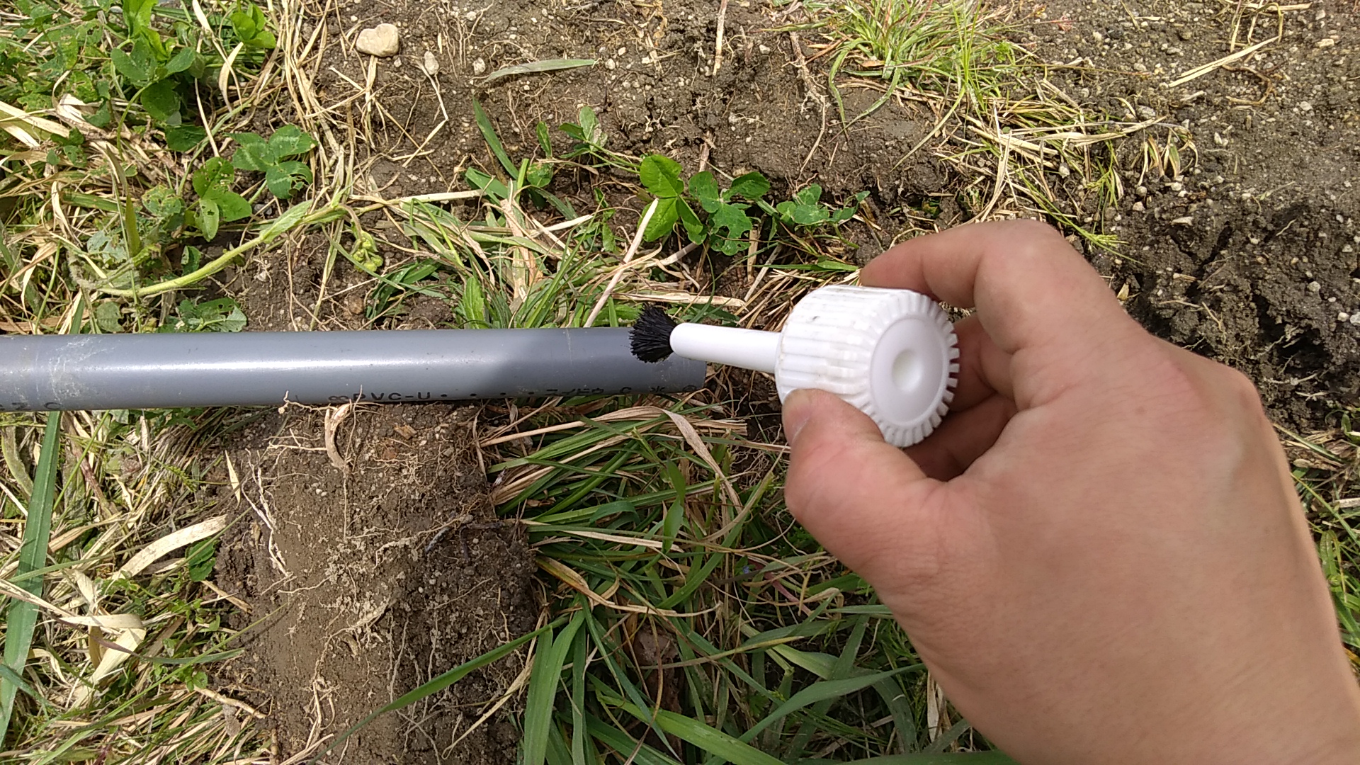 ここは忙しい作業です。ササッとバルブソケットの内側と塩ビパイプの外側に接着剤を付属のハケでたっぷりと塗って。