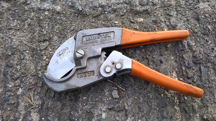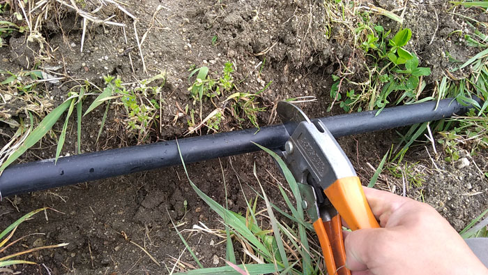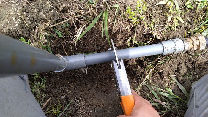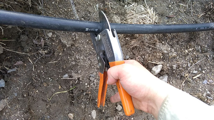 本線をエンビカッターで切断します。ポリエチレンパイプも切りくずが出ることなく綺麗に切断できます。これを手に入れる前はノコギリで切断していました。