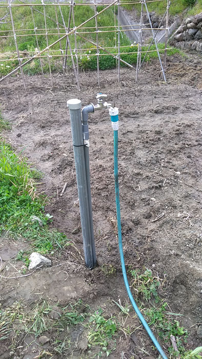 そして完成。2mの単管の先端をハンマーで潰してから、地面に打ち込んで支柱にし、樹脂製サドルバンドと結束バンドで塩ビパイプを固定しました。ホースジョイントとホースも取り付けました。塩ビパイプと継手を接着したあとは、蛇口を解放し、24時間以上乾燥させてから通水します。