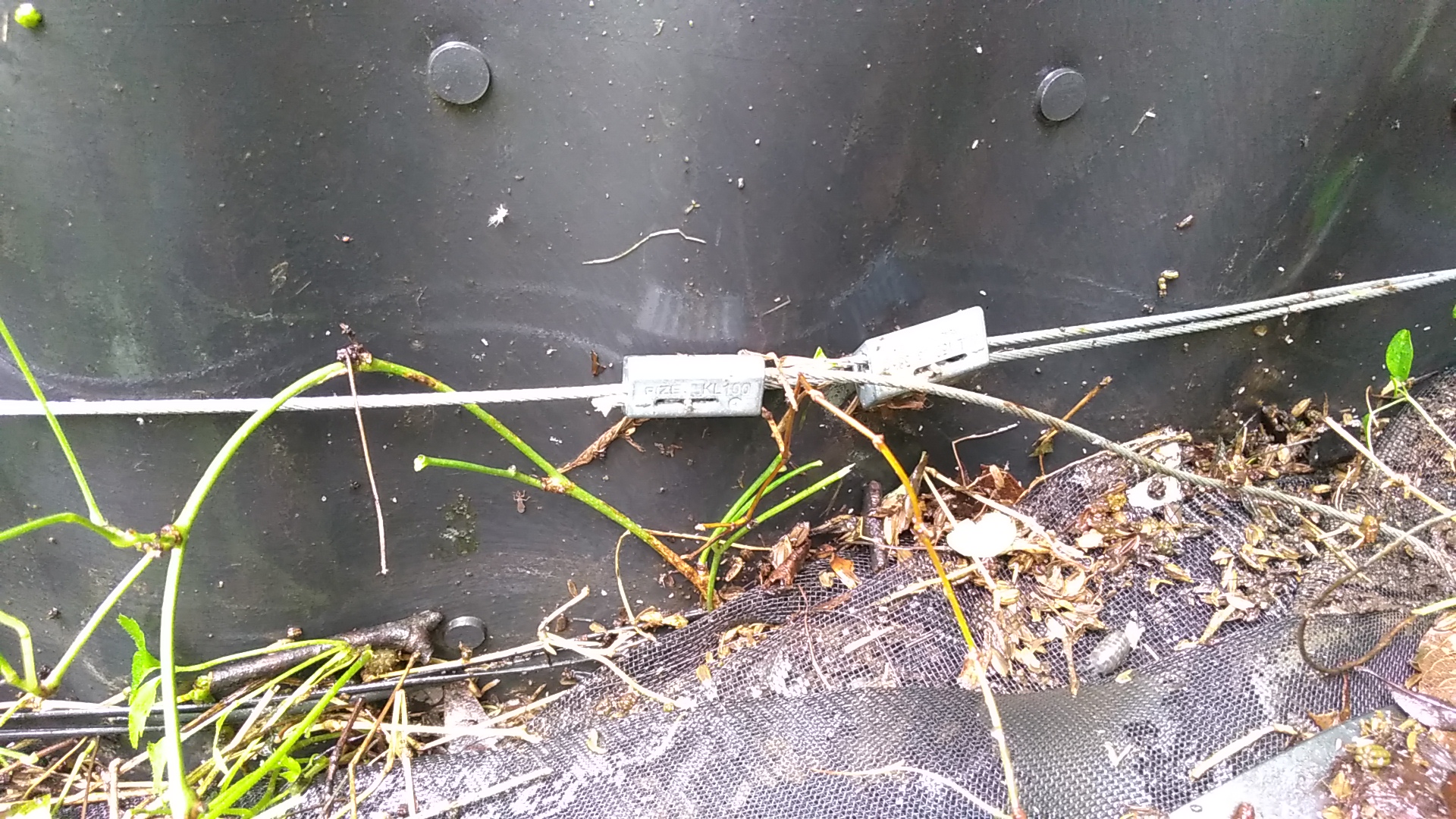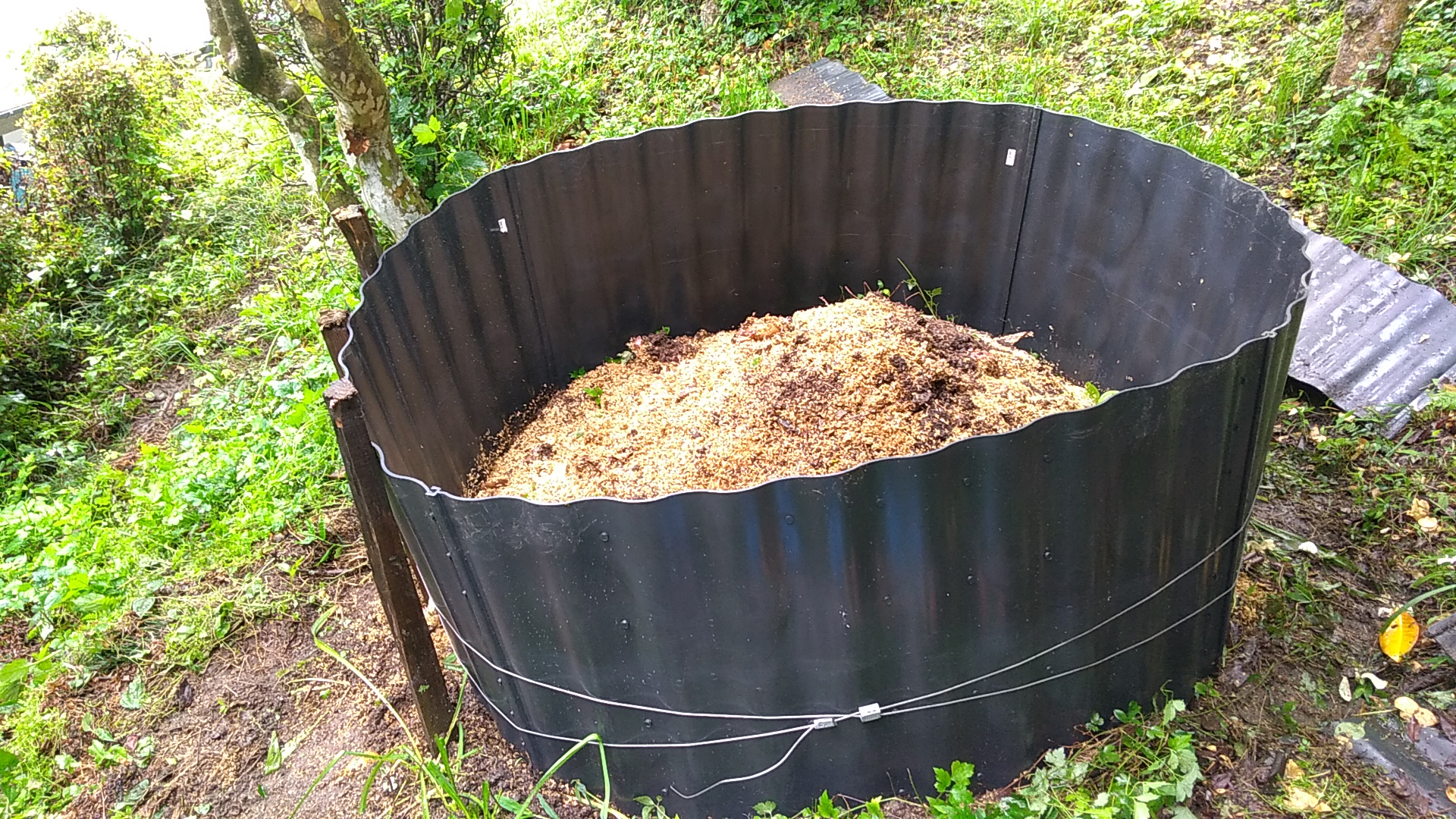 2020年06月19日、畦板波で堆肥枠を作りました。といってもすでに畦板波の40cm幅のものと30cm幅のものを組み合わせて高さ70cmのものを過去に作ってあります。作った当初はうまいこと籾殻と生ゴミを混ぜれていましたが、年月の経過と共にジョイント部分がヘタってしまい、堆肥の重さも相まって簡単に外れるようになってしまいました。そこで、2mmのワイヤーとリーズロックというワイヤーロープロックを購入し畦板波を縛り付けてみました。これにより荷重がかかる下部については、ジョイントが外れてもなんとか持ちこたえることができました。しかし上部はカラスが止まり写真のように上下の枠が簡単に外れてしまいます。もー駄目だー。ということで新たな策を考えます。いろいろなものが放り込まれおり、汚いのでモザイク処理。
