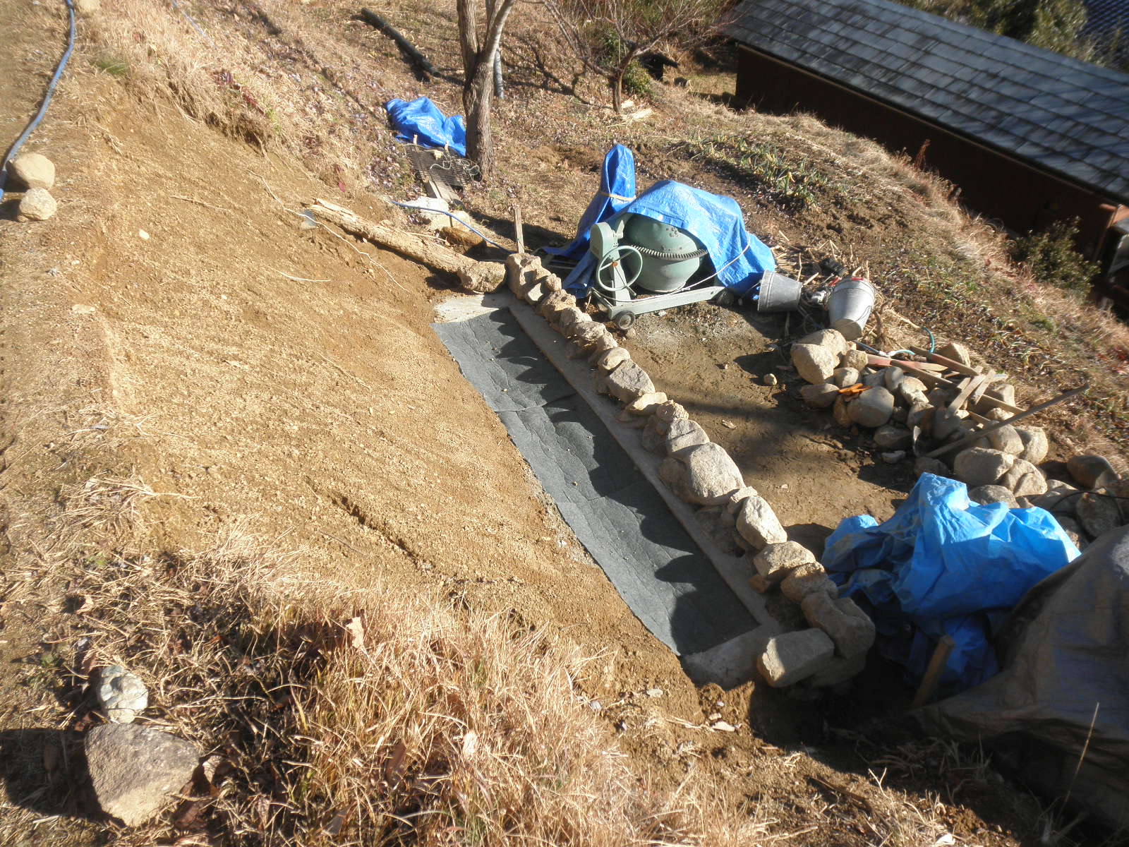 写真が無いのですが、この後、裏込め材の土砂をランマーで突き固め、その上に止水コンクリートを5cm打設しました。相手が天然の石なので大きさにバラつきがあり、裏込めコンクリート厚を確保するためにエンジンカッターで石を切断する場面が何度もありました。コンクリートは1回目は生コン屋から空練りを0.15立米購入し、軽トラで自宅まで運び、運搬車へ移して現場まで運び、コンクリートミキサーで練って打設しました。その後、2、3、4回目は0-40mmの砕石を25mmのフルイにかけてポルトランドセメントと混ぜて打設しました。