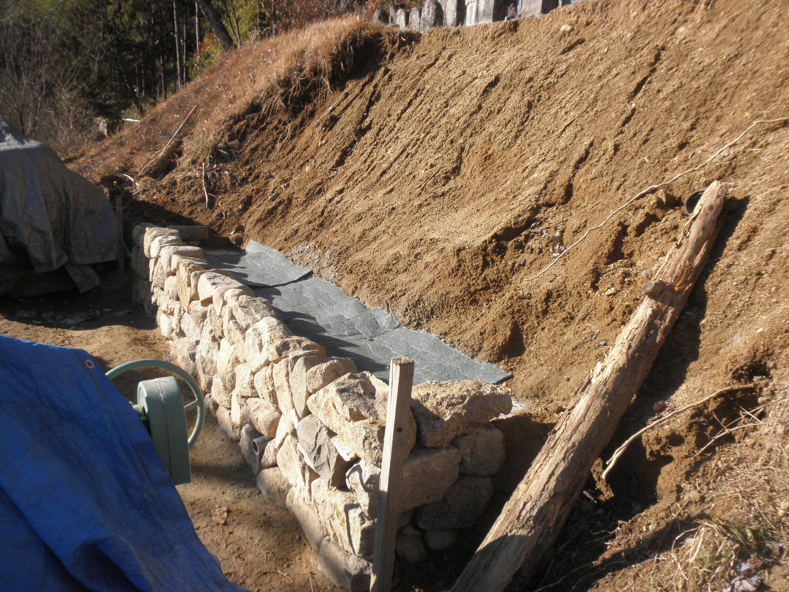 すべて積み終わりました。生コン打設もあと1回となりました。止水コンクリートから上の裏込め材は0-40mmの砕石を使用しましたが、ここからは土砂となるため、砕石の上へステラシートを敷きます。余談ですが地元の金物屋さんでステラシート1m×10mが3,400円もしました。ちょっと前は3,000円しなかったと思います。。