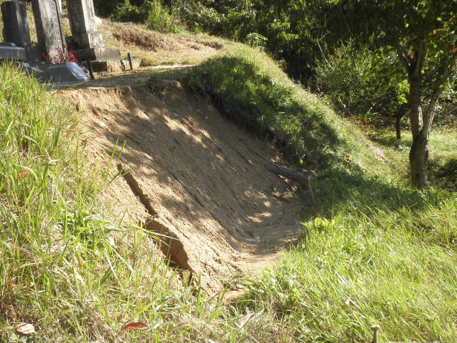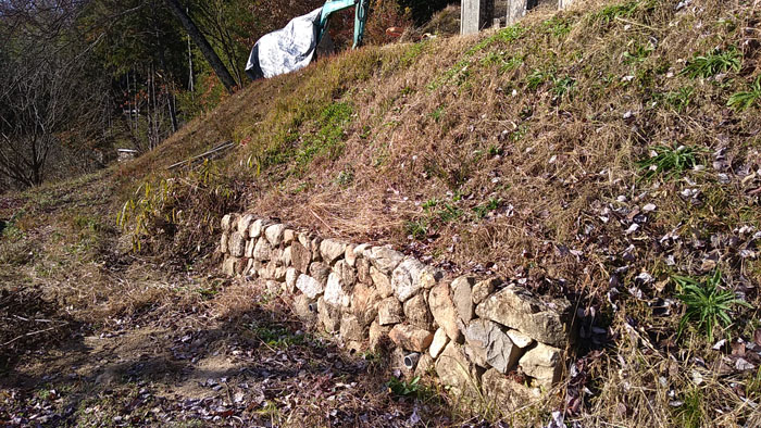 2017年10月30日の台風で墓の下の土手が崩落しました。今回も自力でやるしかありません。崩落の幅が3m程度なことから2013年に崩れた石垣の石を使って練り積みを実施することとなりました。生コン打設時のみ父に手伝いをお願いし、その他はすべて自分一人で行います。ユンボで道を作りながらここまで到達し、運搬車10台分以上はあったでしょう。土砂を離れた空き地まで運びました。新しい運搬車にはリフト・ダンプ機能があり、軽トラへ直接土砂を積み込むことができます。軽トラにもダンプ機能があり大活躍しました。