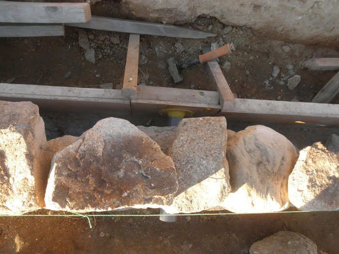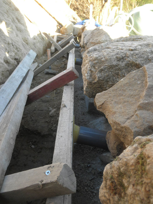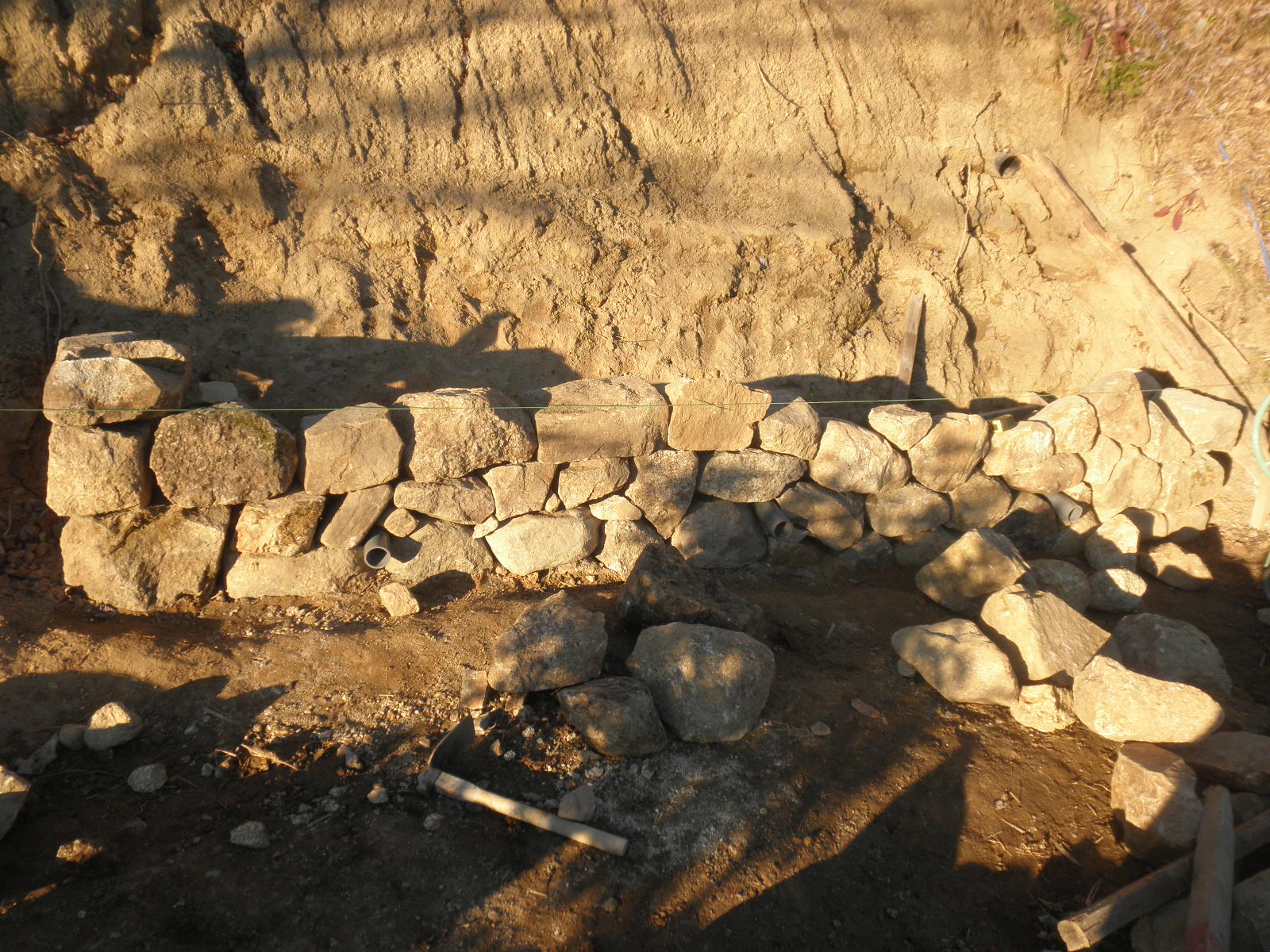 いきなり、ですがここまで進んだ写真です。石積みも初めてのようなものなので、とにかく3段は積まないと形が見えてこない不安がありました。今回も3カ所水抜きパイプを使います。ちなみにパイプはVP50です。基礎は砕石0-40mmを15cm、とその上にドデカい根石です。
