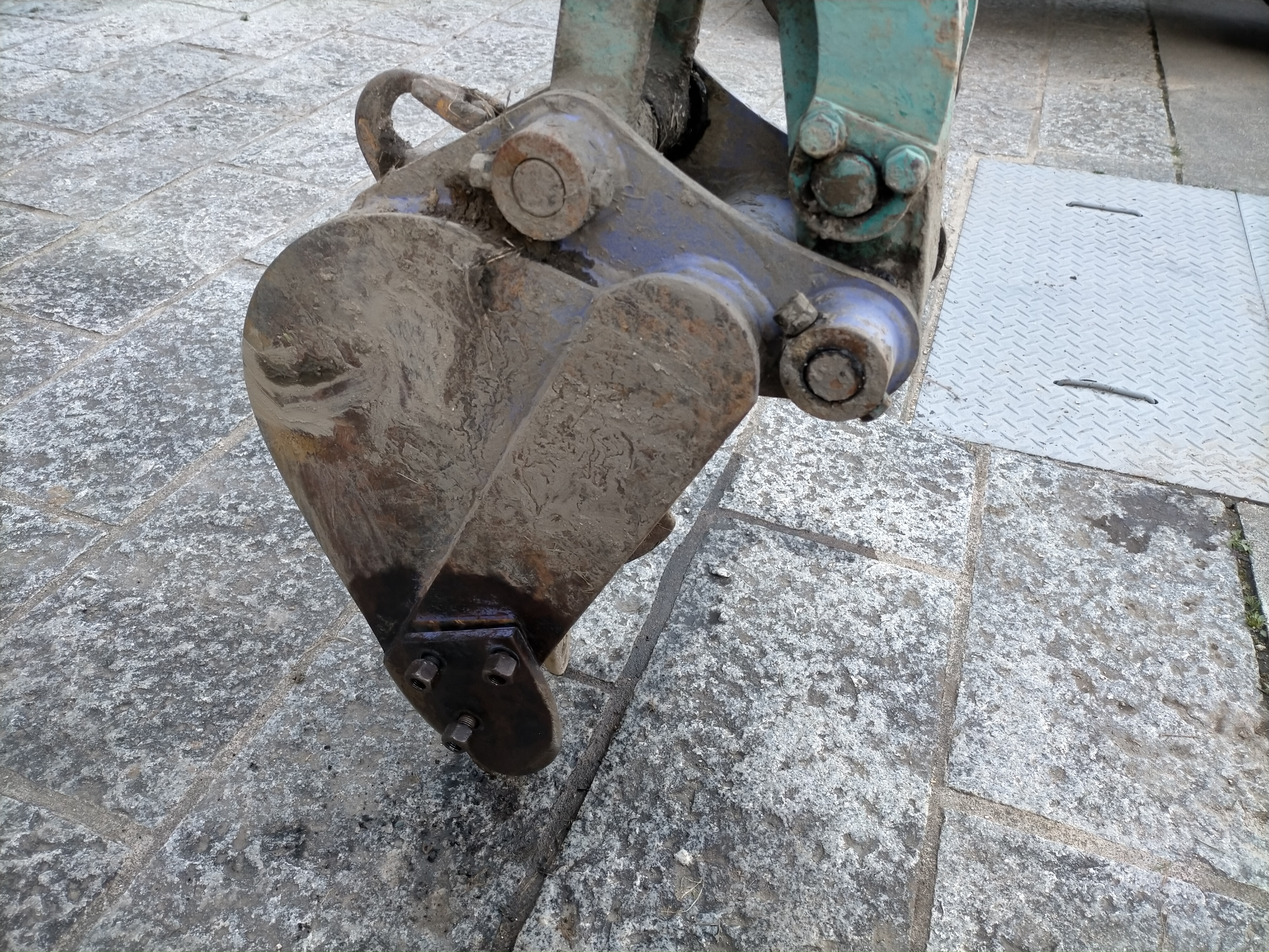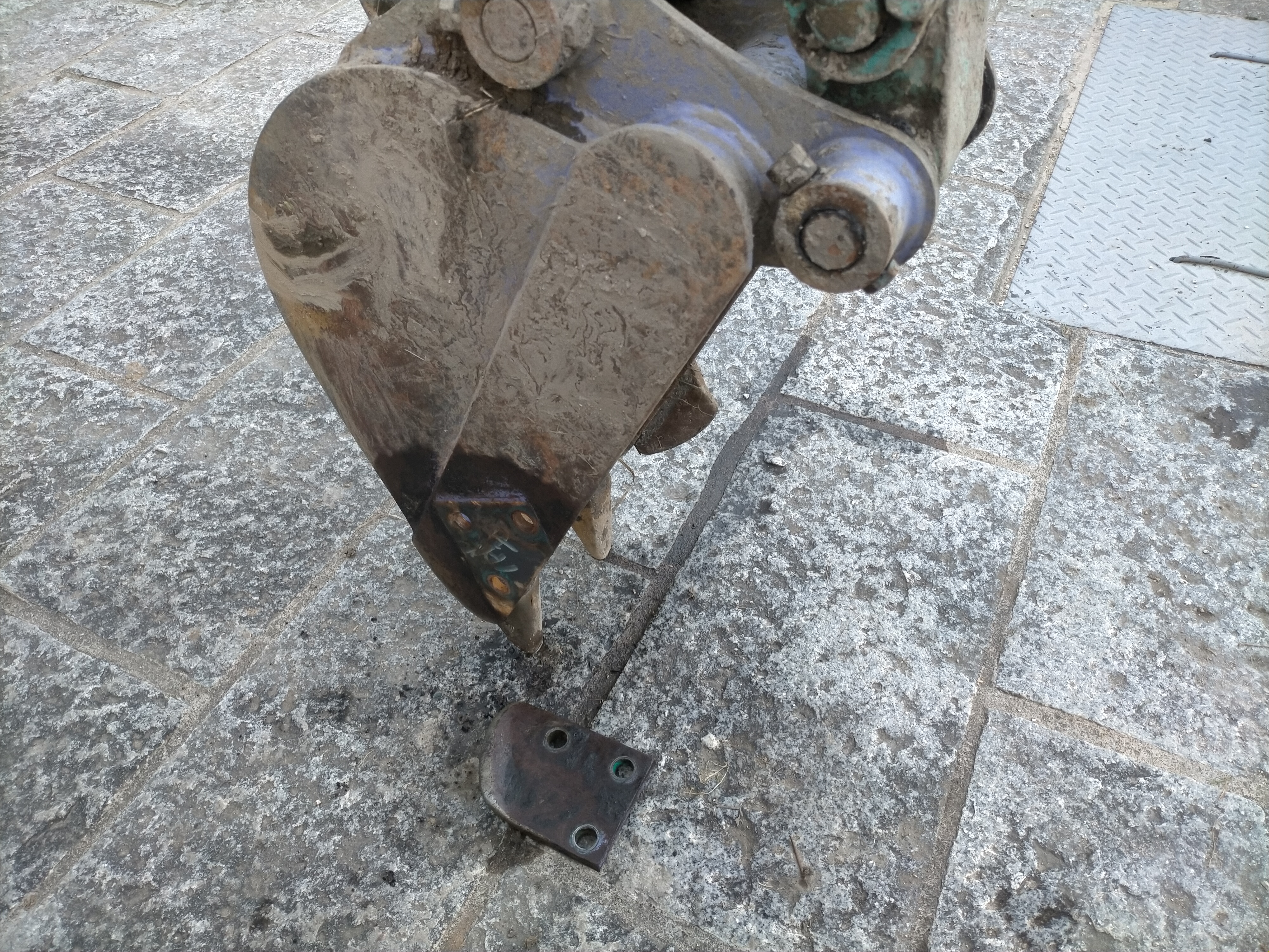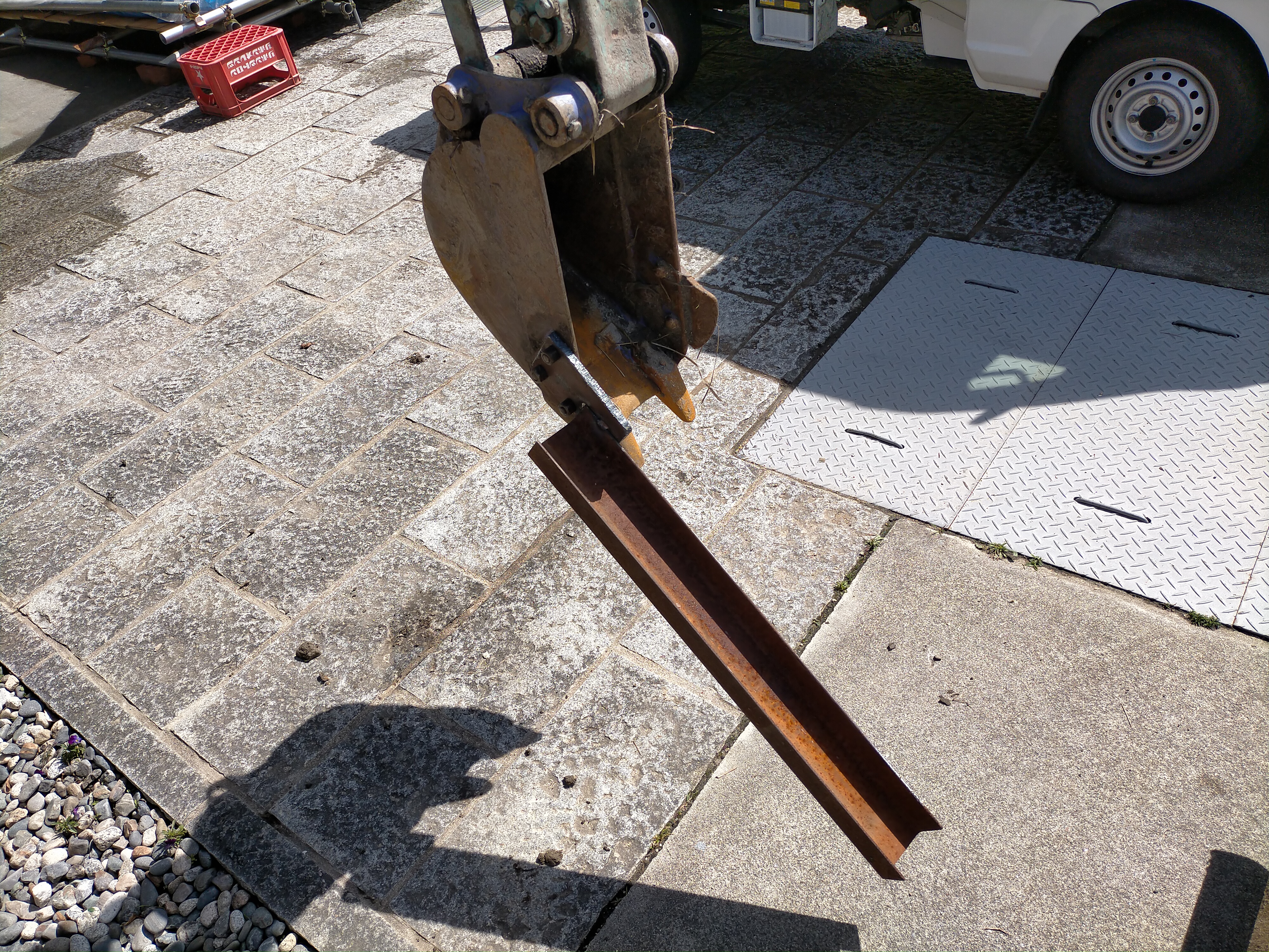 バケットのどこかにチャンネル(溝形鋼)を取り付けて、それで狭い側溝清掃をしたいと思いました。どこに取り付けようかバケットを観察してみるとサイドカッターがボルトで止まっていることを発見しました。ここに取り付けよう。
