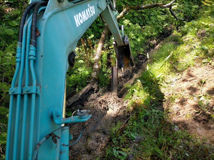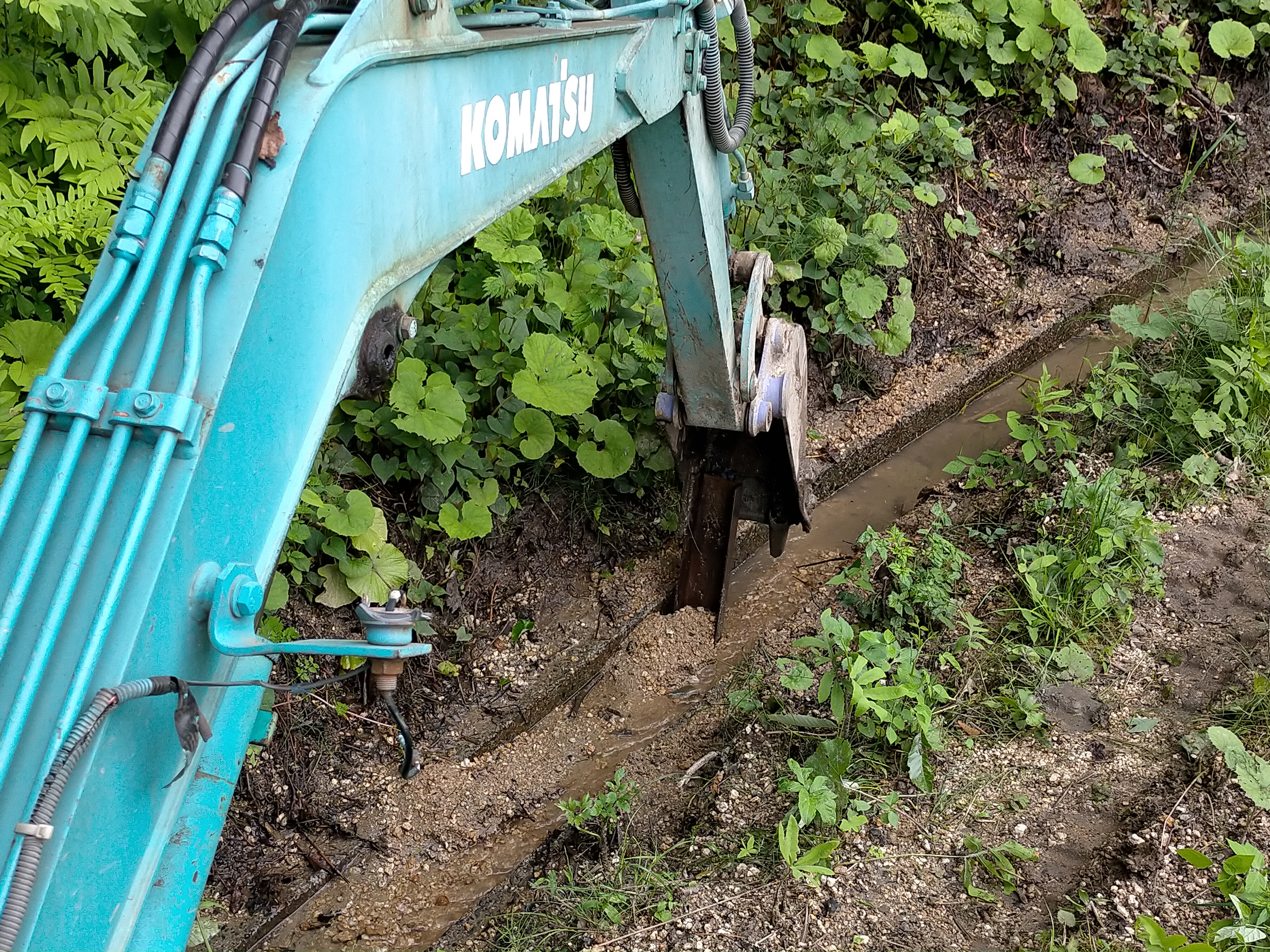 こんなふうにエンジンウェルダーで溶接しました。まだ、写真ではまだ溶接してないですが。一応完成し、実際に側溝を掘ってみました。